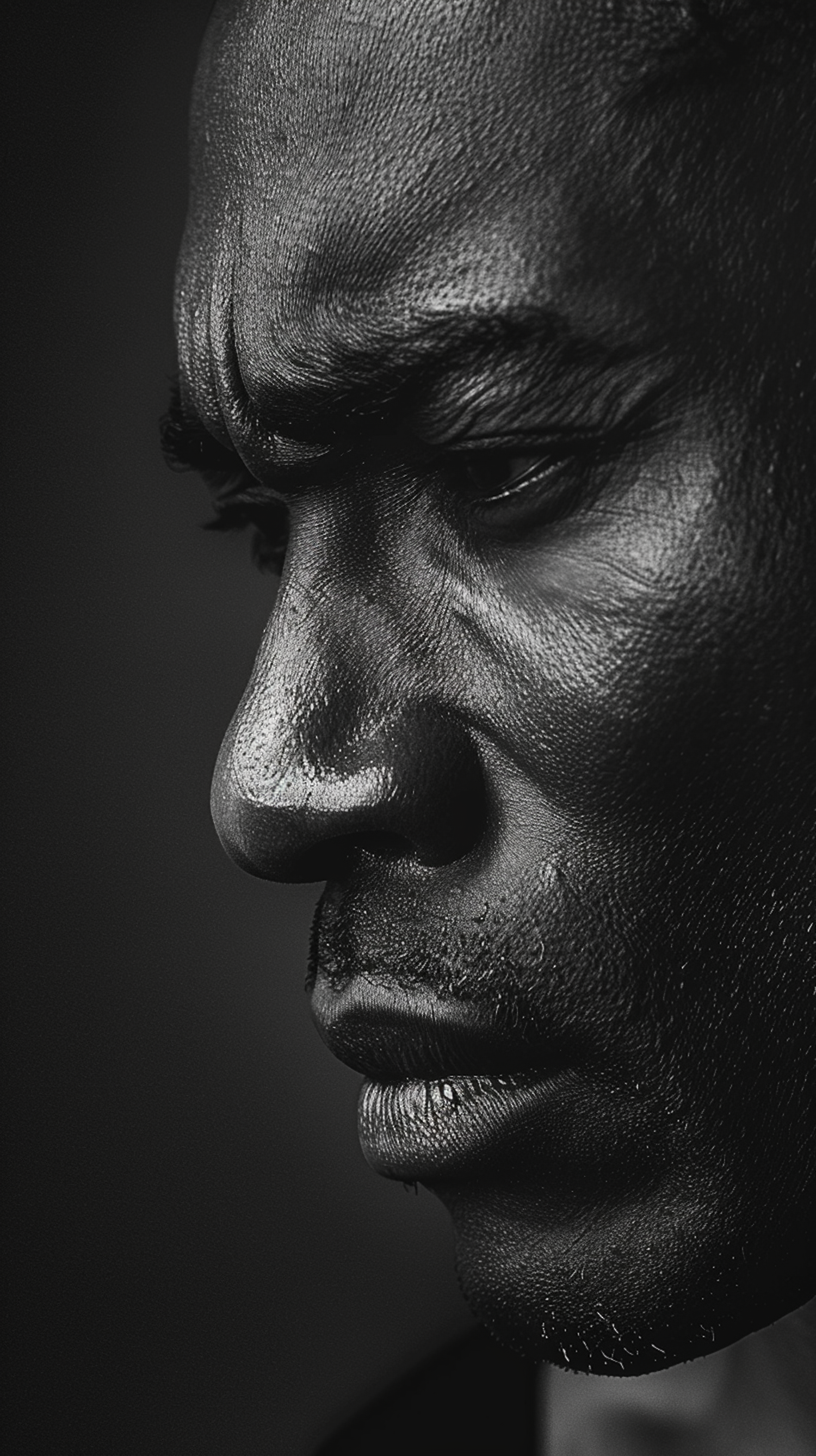 Intense black and white close-up portrait of a man with textured skin and a serious expression, highlighting facial contours.