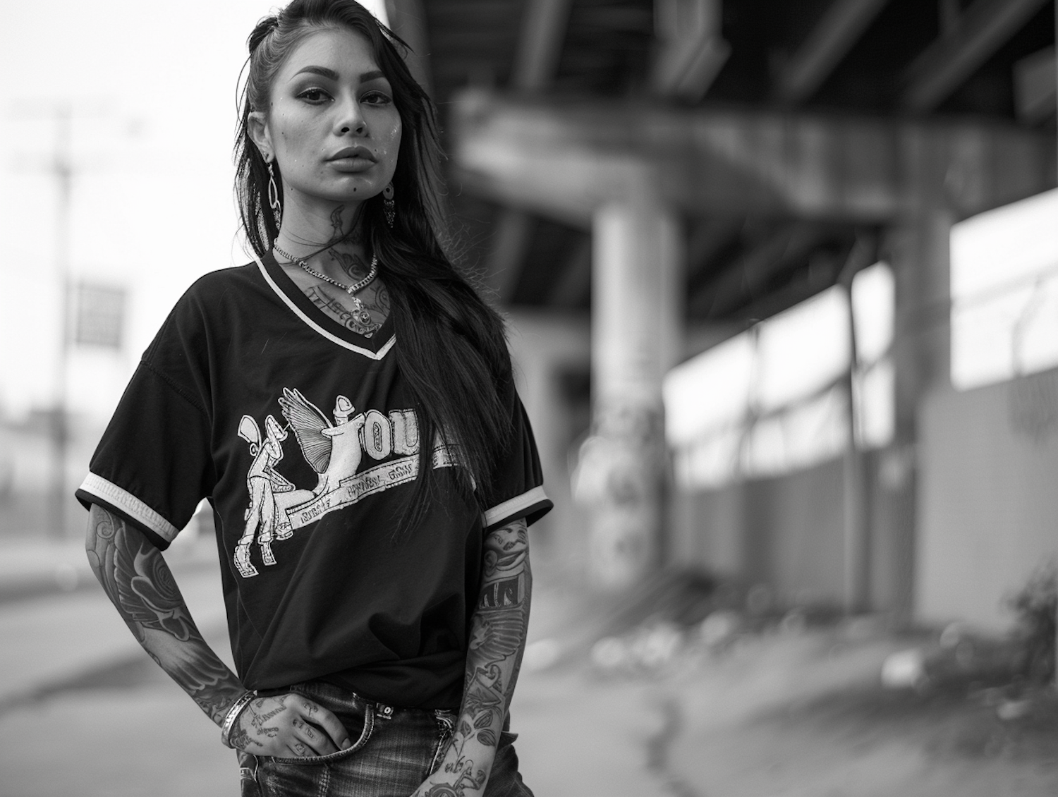 Black-and-white portrait of a tattooed woman in an urban setting, exuding confidence and style under an overpass.