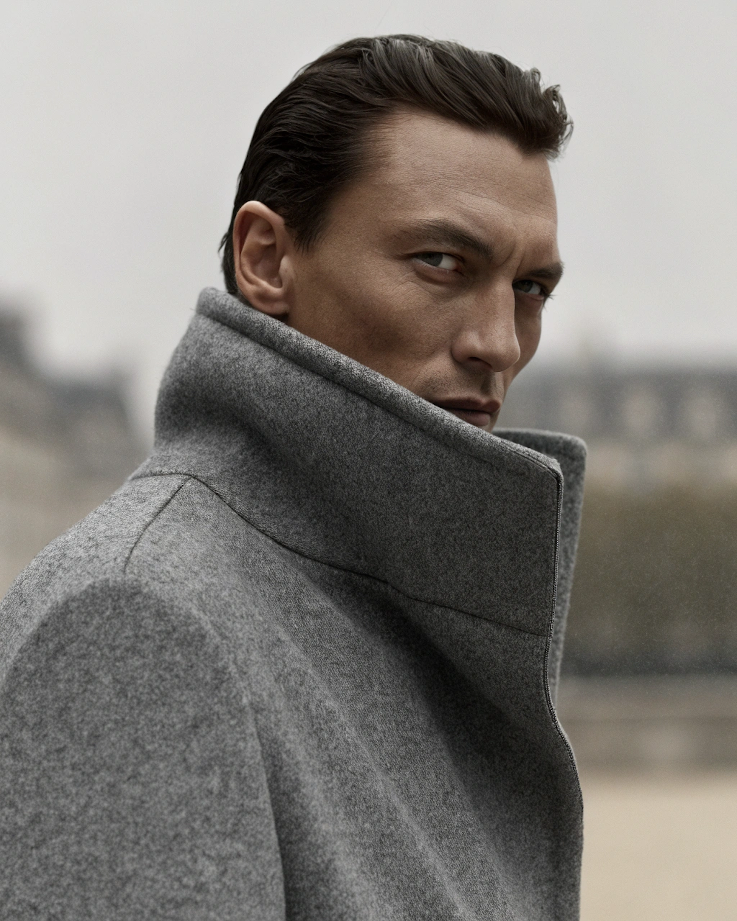 Close-up of a man in a high-collared gray coat, with slicked-back hair and an intense gaze, set against a blurred, muted urban background.