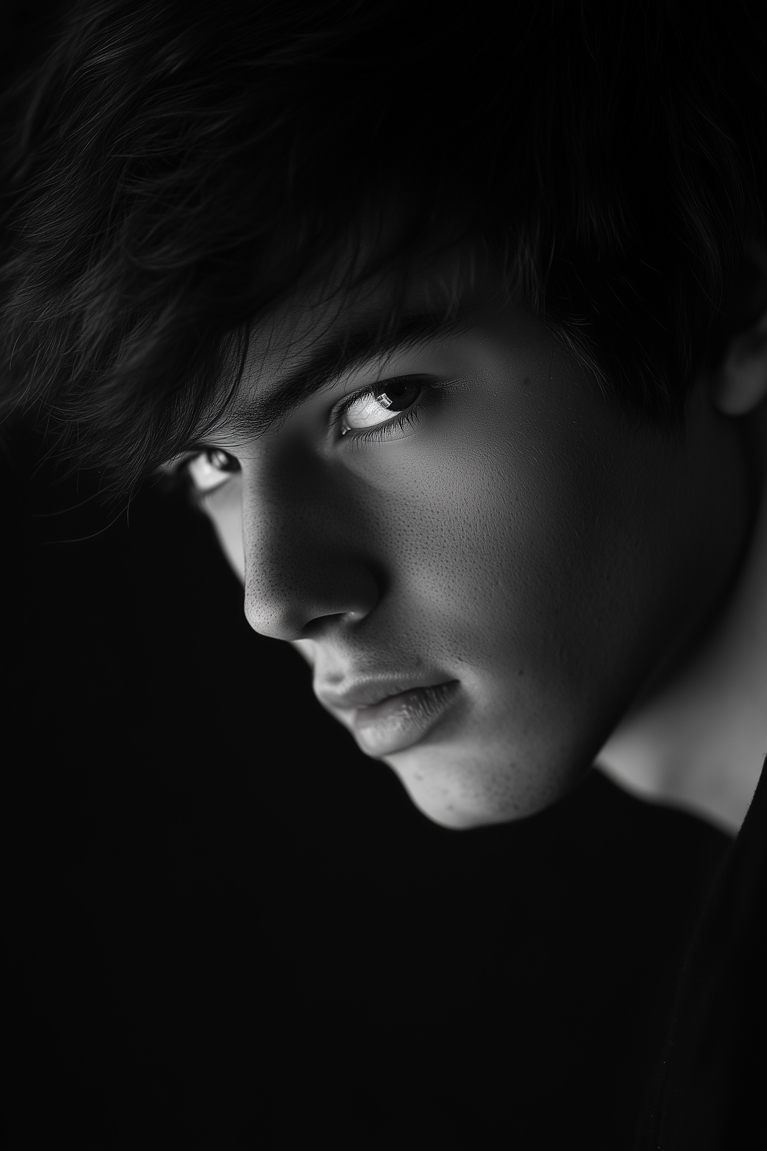 Dramatic black-and-white close-up portrait of a young man with intense gaze, textured skin, and dark background.