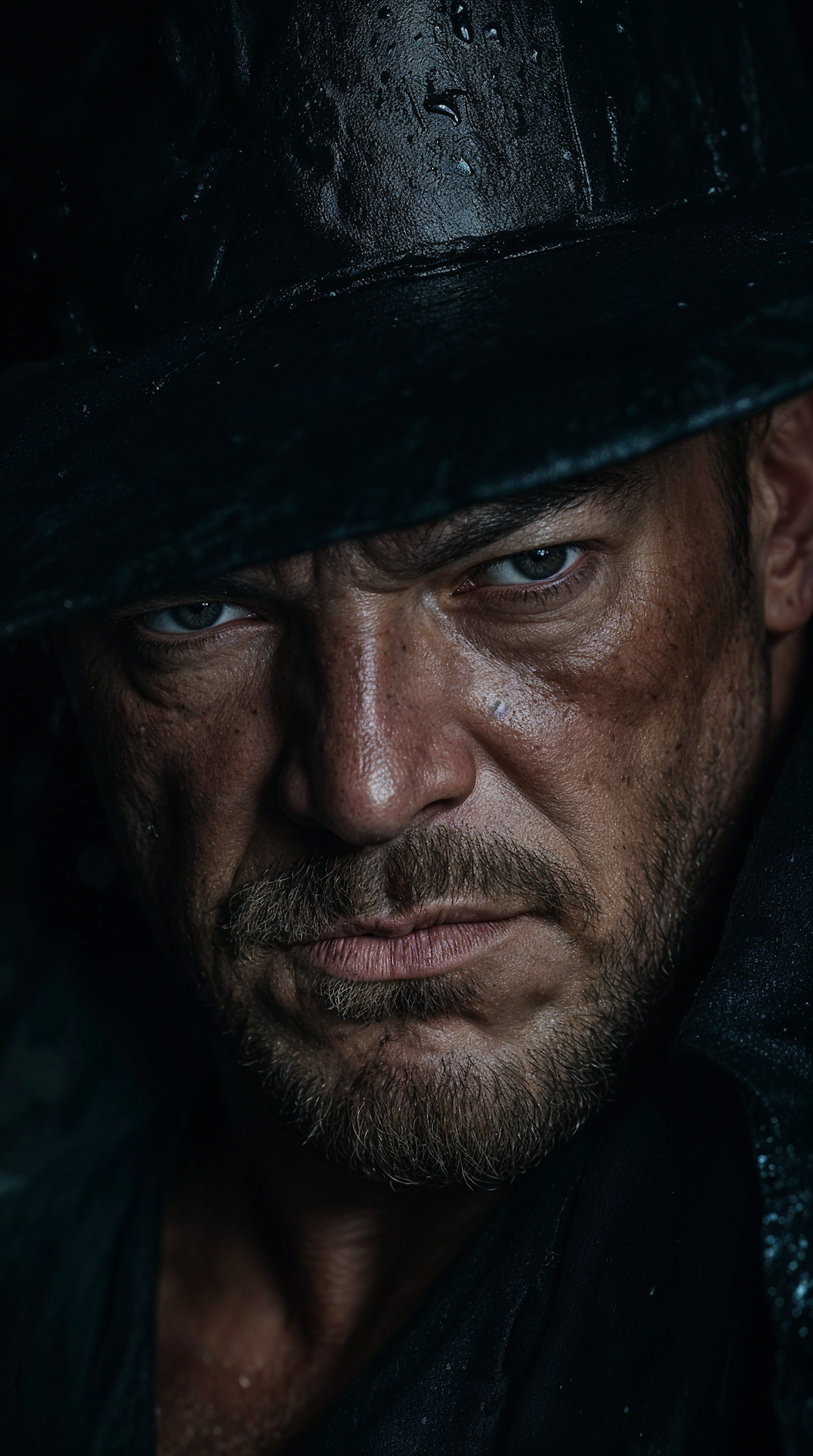 Close-up of a rugged man with a wet black hat, blue eyes, and a stern expression, creating a dramatic and intense atmosphere.