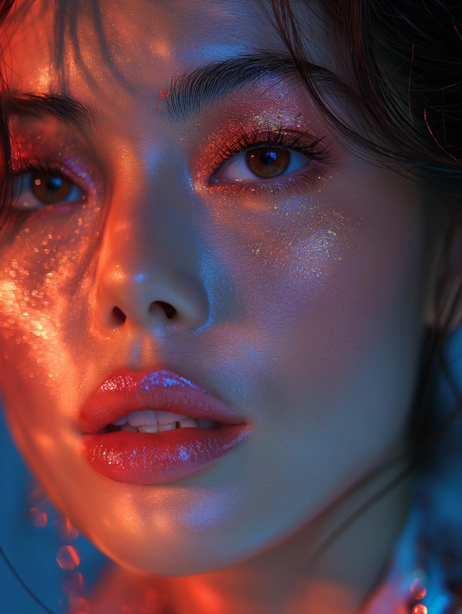 Close-up of a woman with shimmering makeup and colorful lighting, highlighting her glowing skin and glossy lips.