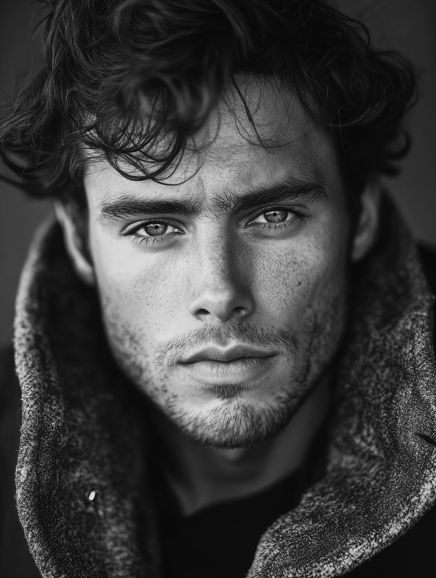 Black and white portrait of a young man with curly hair and intense gaze, wearing a textured coat. Dramatic lighting enhances details.
