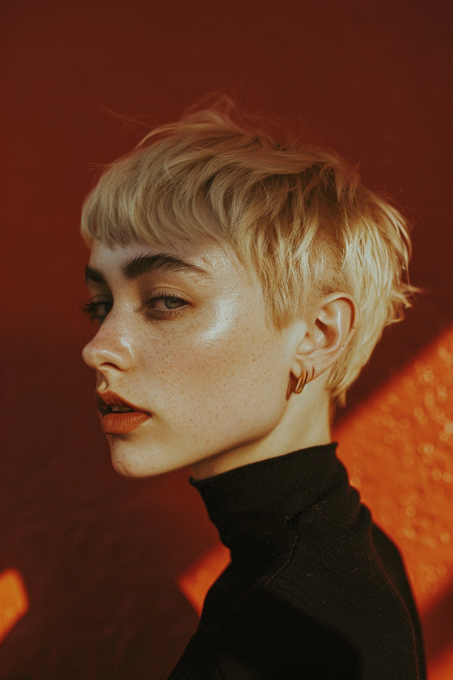Striking portrait of a woman with short blonde hair and glowing skin against a warm background, exuding elegance and style.