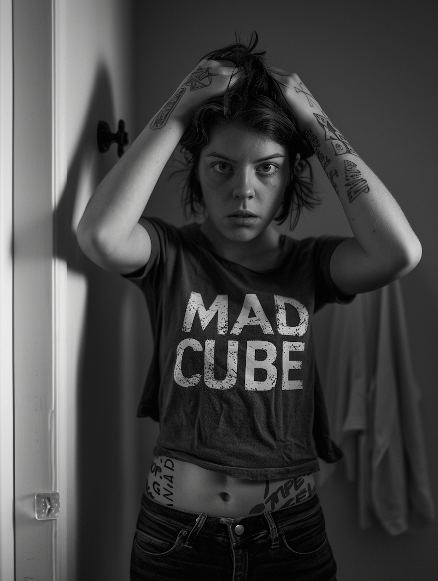 Young woman with tattoos and 'MAD CUBE' shirt, holding hair with intense expression. Dramatic lighting and minimal background.