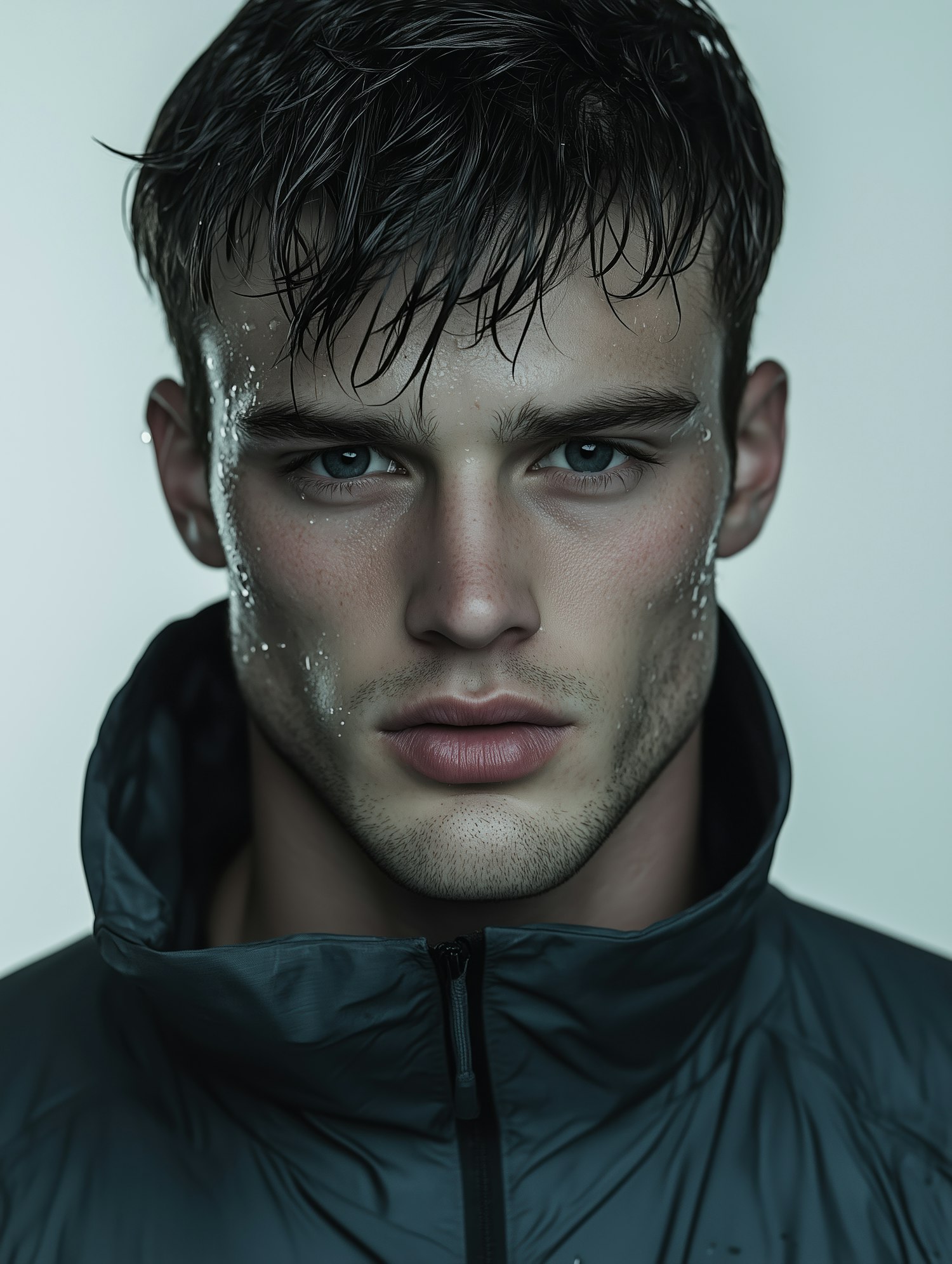 Close-up of a young man with wet hair, blue eyes, and a dark jacket, exuding a sporty and intense vibe with water droplets on his face.
