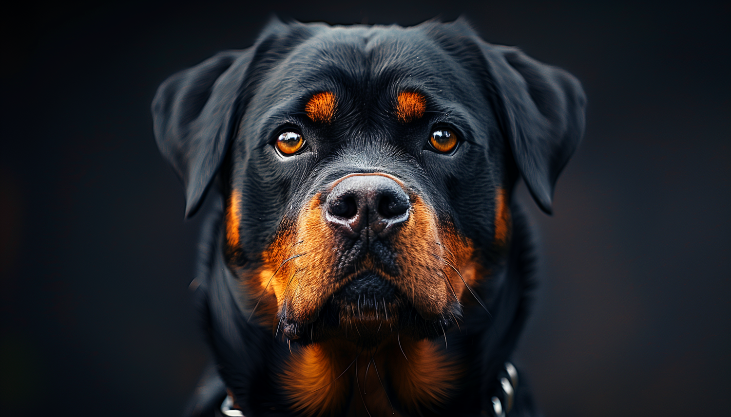 Close-up of a Rottweiler with intense amber eyes, sleek black coat, and tan markings, set against a dark, blurred background.