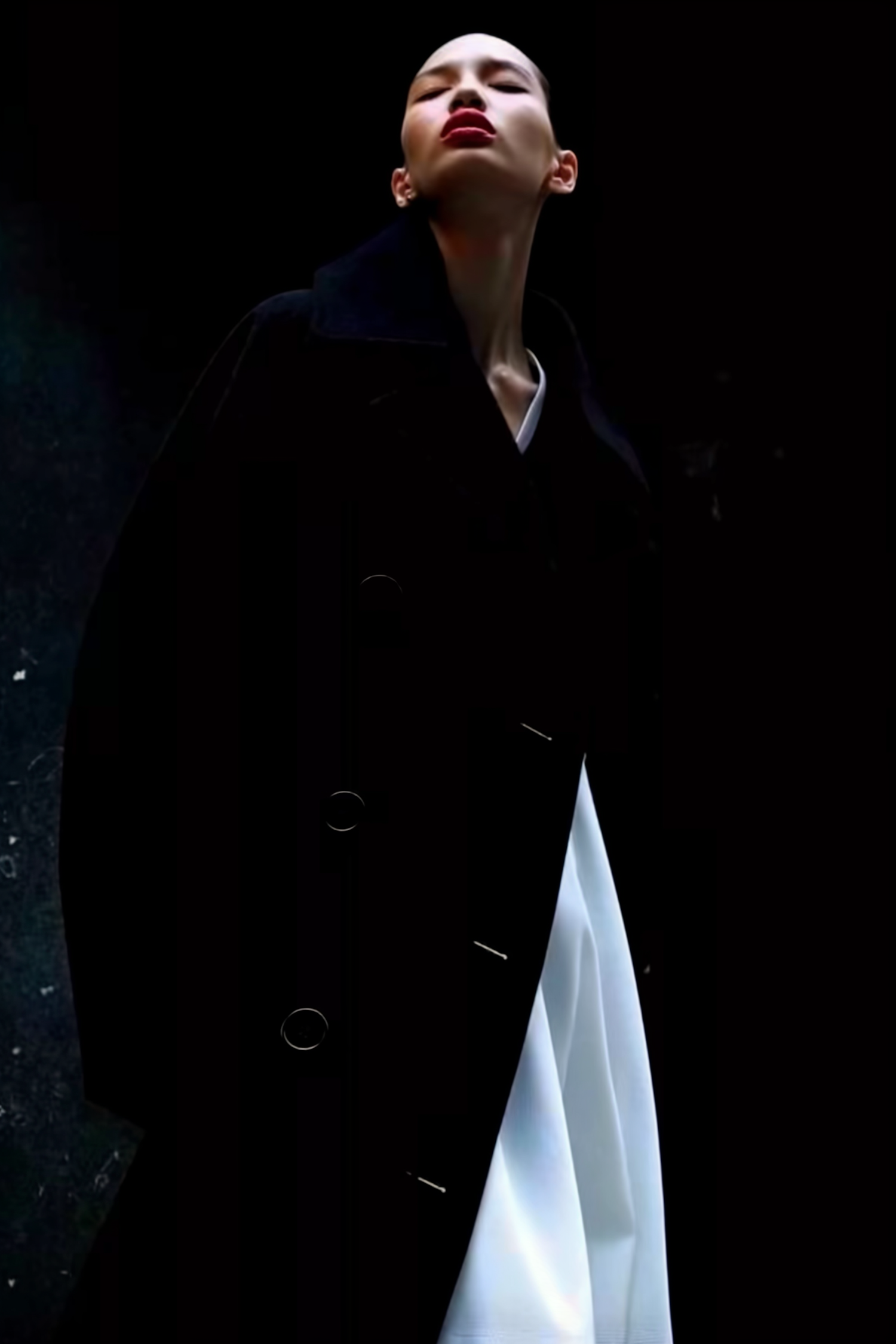 Mysterious figure in a dark coat with a white garment, face blurred, dramatic lighting and contrast create a striking visual.