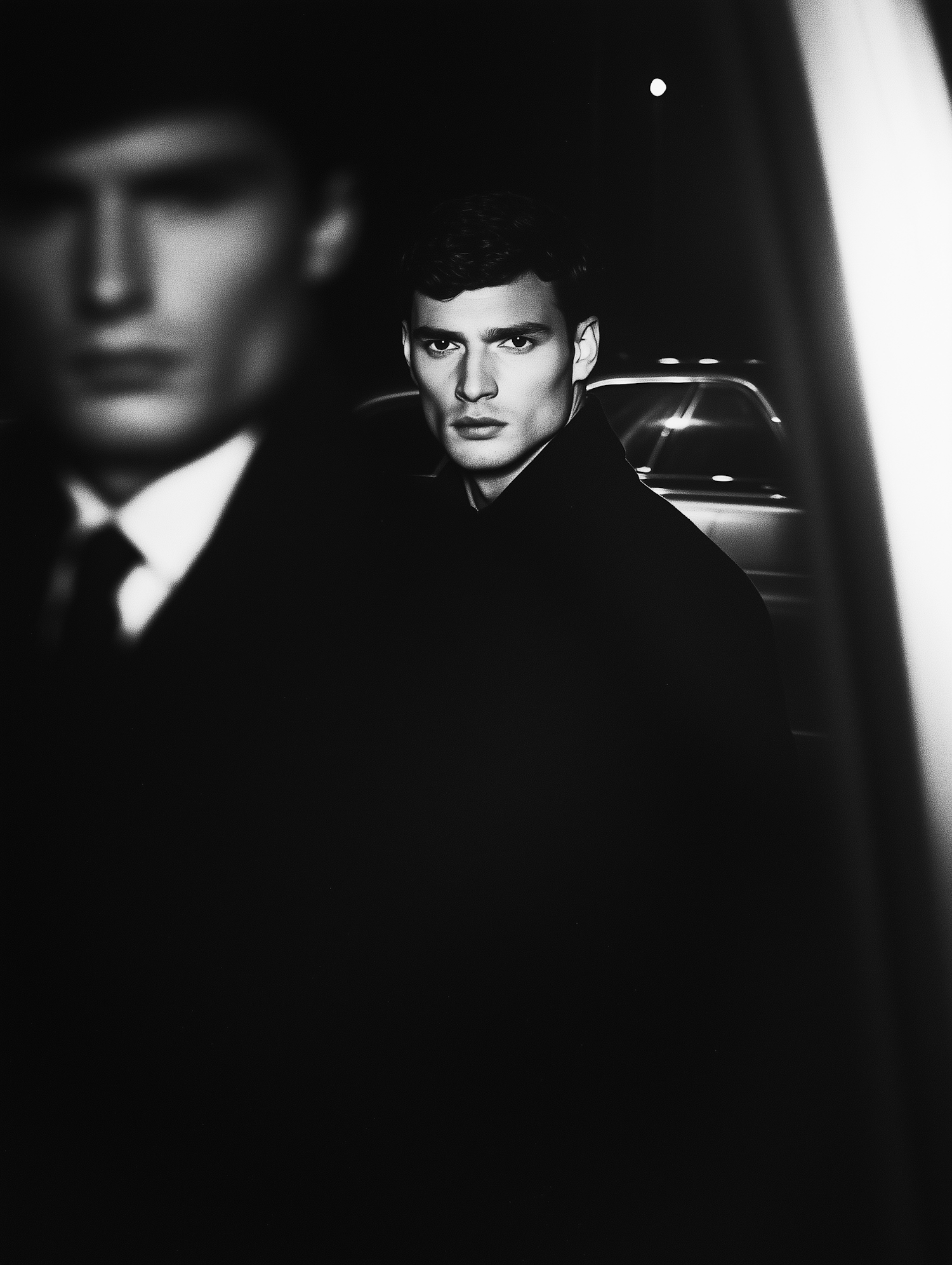 Black and white photo of a man in focus with intense gaze, blurred figure in foreground, creating a mysterious and cinematic atmosphere.