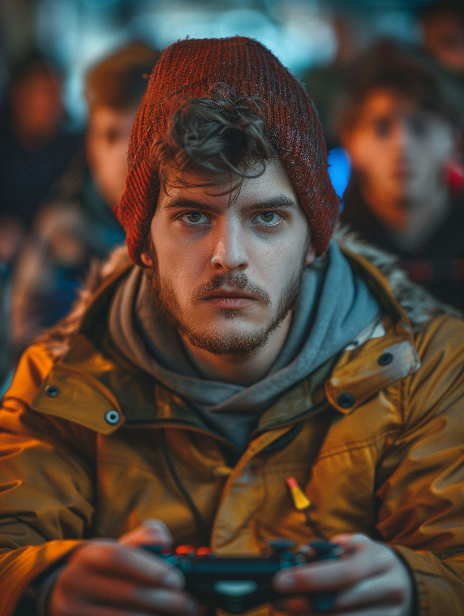 Young man in a beanie and yellow jacket intensely gaming, holding a controller. Blurred background with other players.