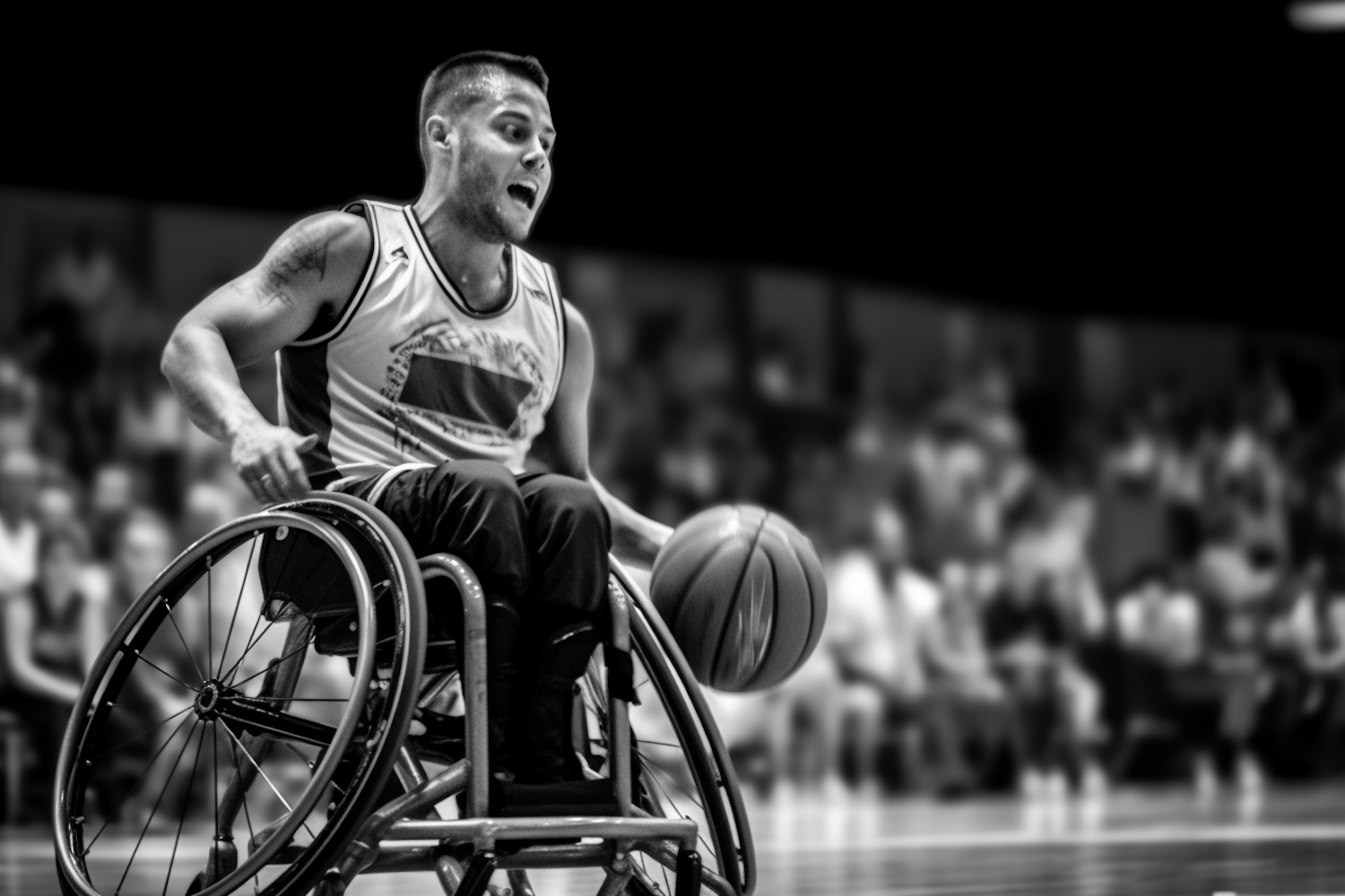 Energetic wheelchair basketball player in action, showcasing determination and athleticism in a dynamic sports scene.
