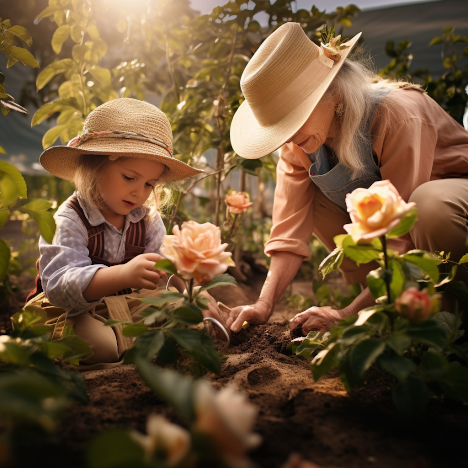 Grandmother and granddaughter gardening together, surrounded by blooming roses and sunlight, sharing a tender moment in nature.