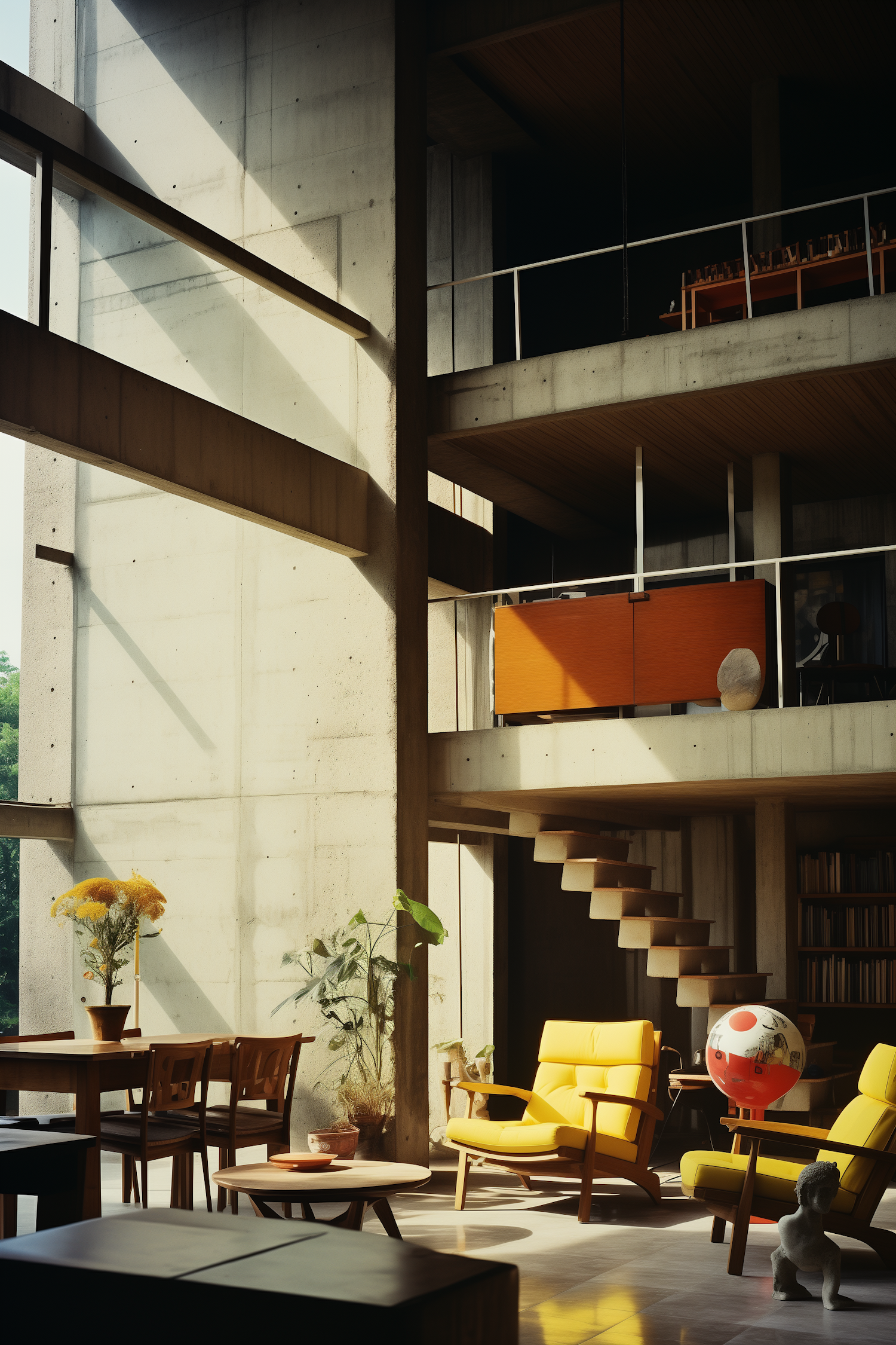 Modern interior with concrete walls, yellow armchairs, and floating stairs. Natural light and minimalist design create a serene atmosphere.