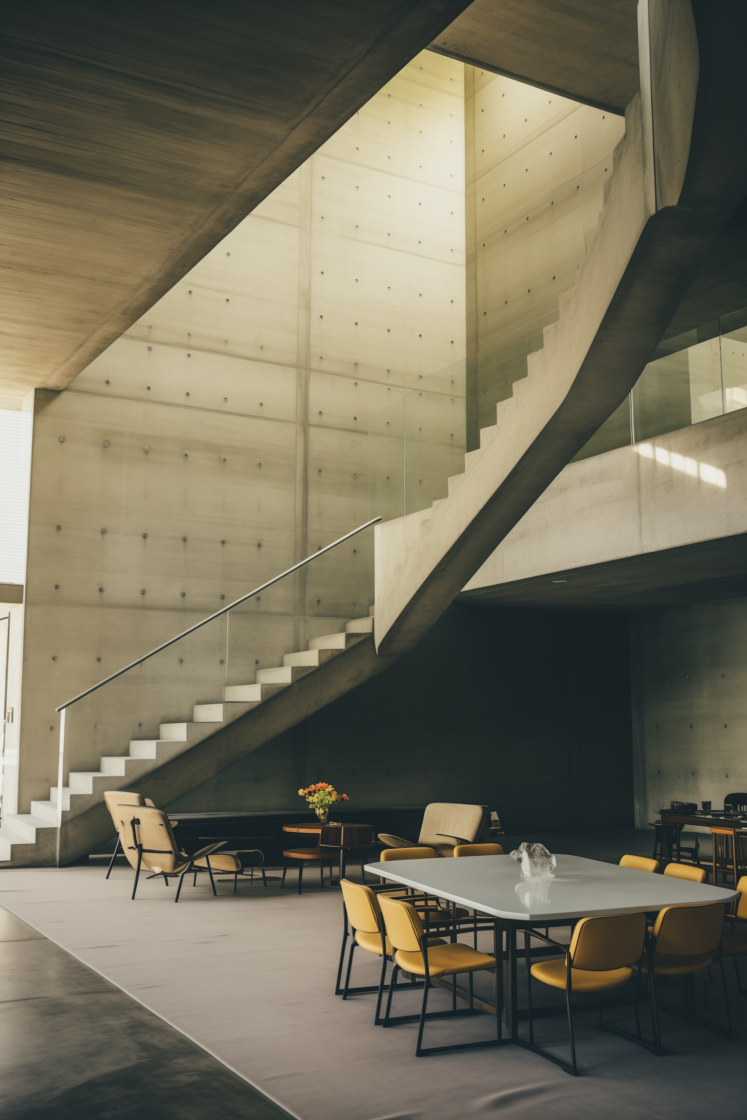 Modern minimalist interior with concrete staircase, yellow chairs, and natural lighting. Sleek design with a pop of color.