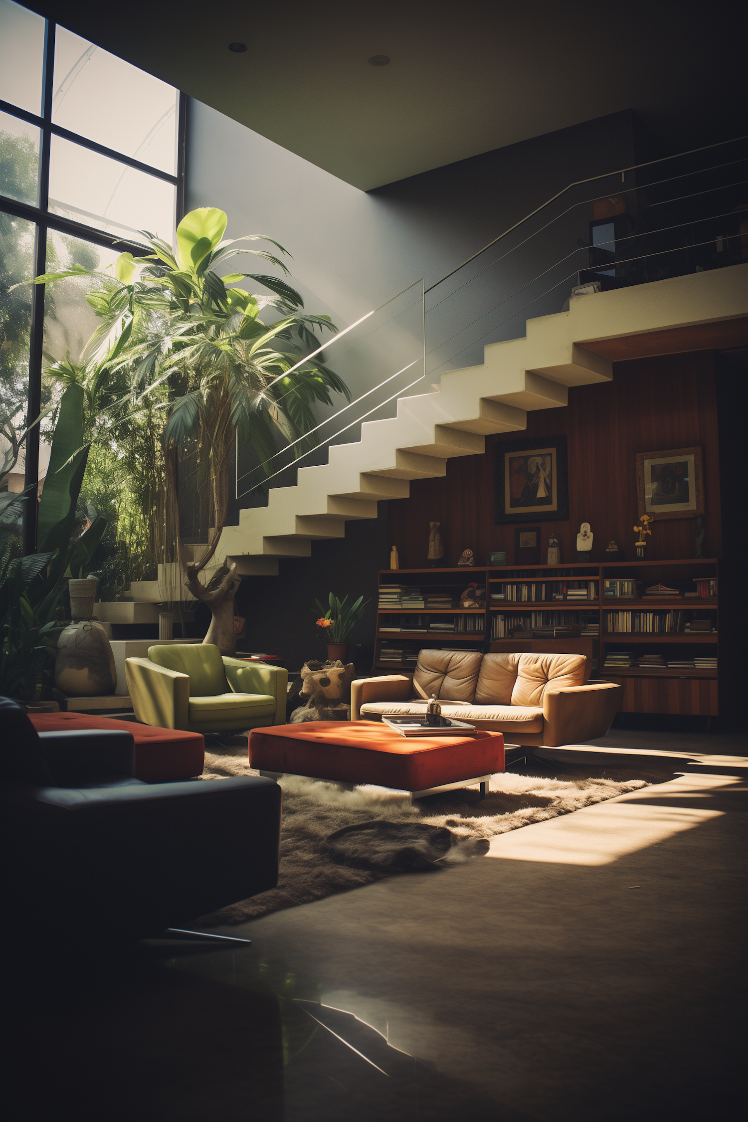 Modern living room with large windows, sleek staircase, cozy seating, and lush plants. A blend of contemporary and natural design.