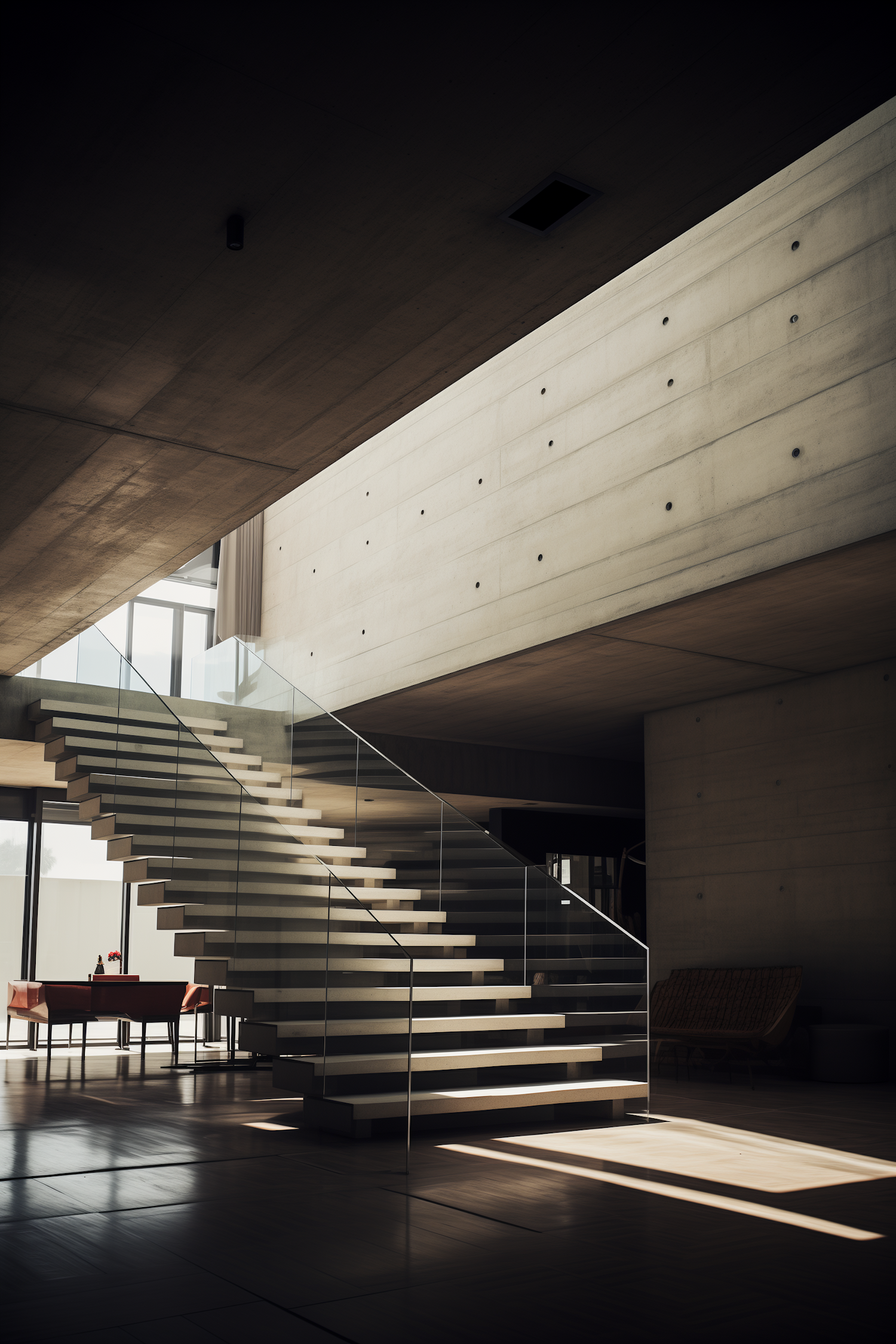 Modern interior with a sleek floating staircase, glass railing, and sunlight casting shadows on a polished floor. Minimalist elegance.