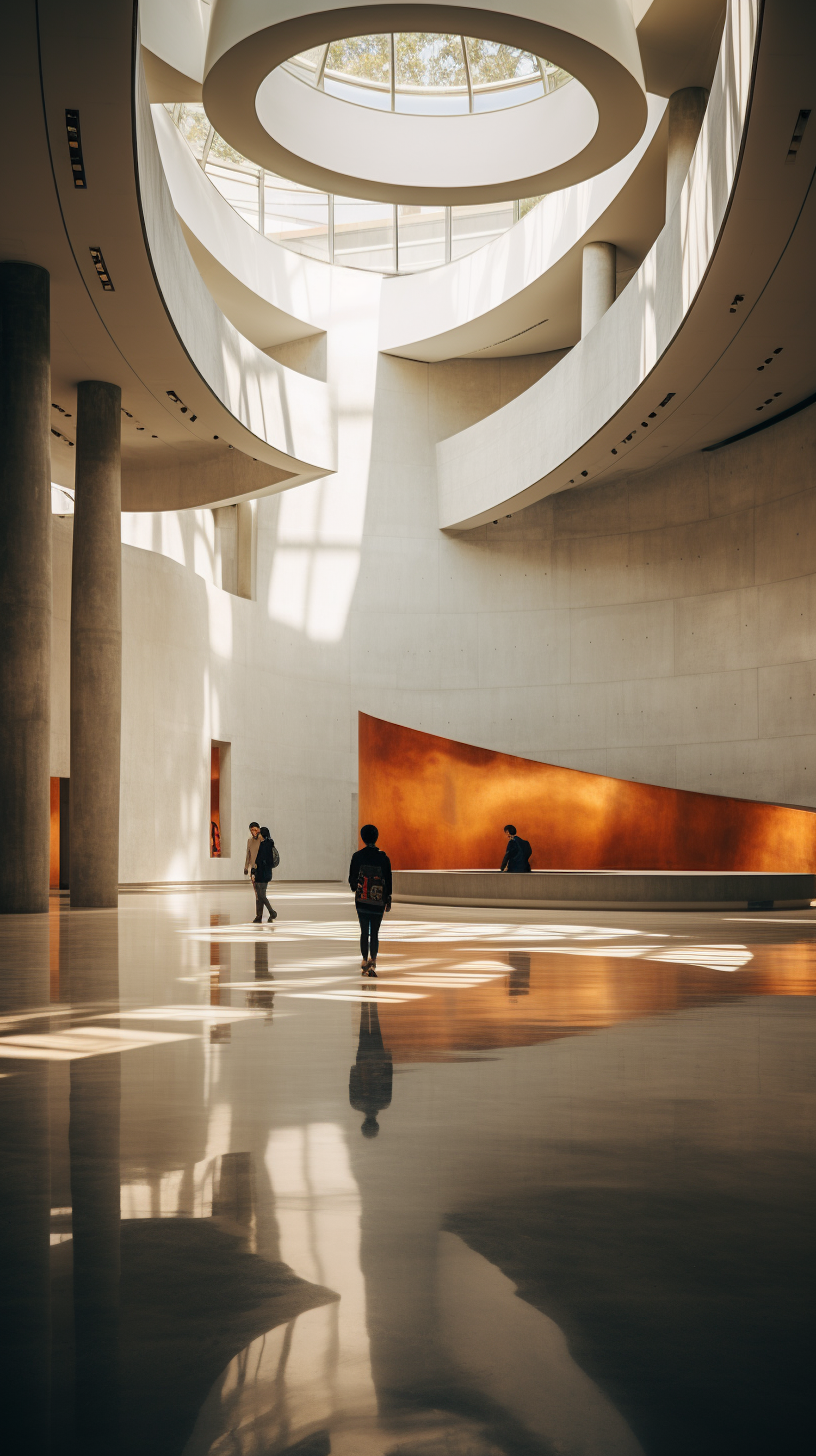 Modern architectural interior with skylight, curved walls, and polished floors. Three people walk, reflecting on the shiny surface.