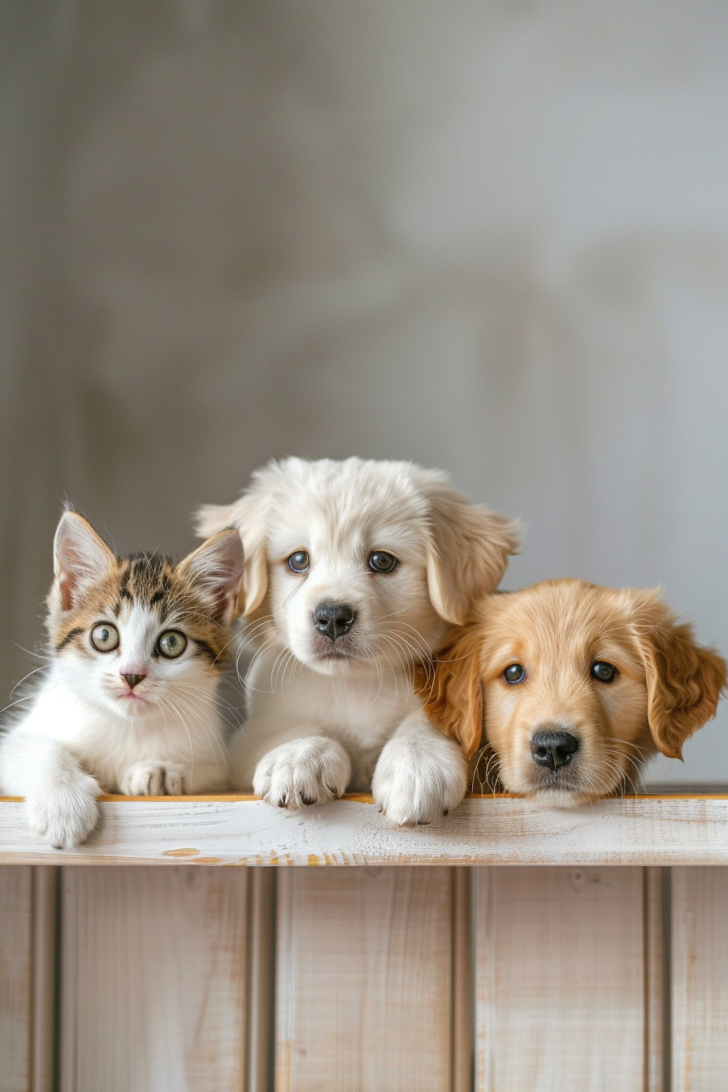 Adorable kitten and puppies peeking over a wooden ledge, showcasing their playful and curious nature.