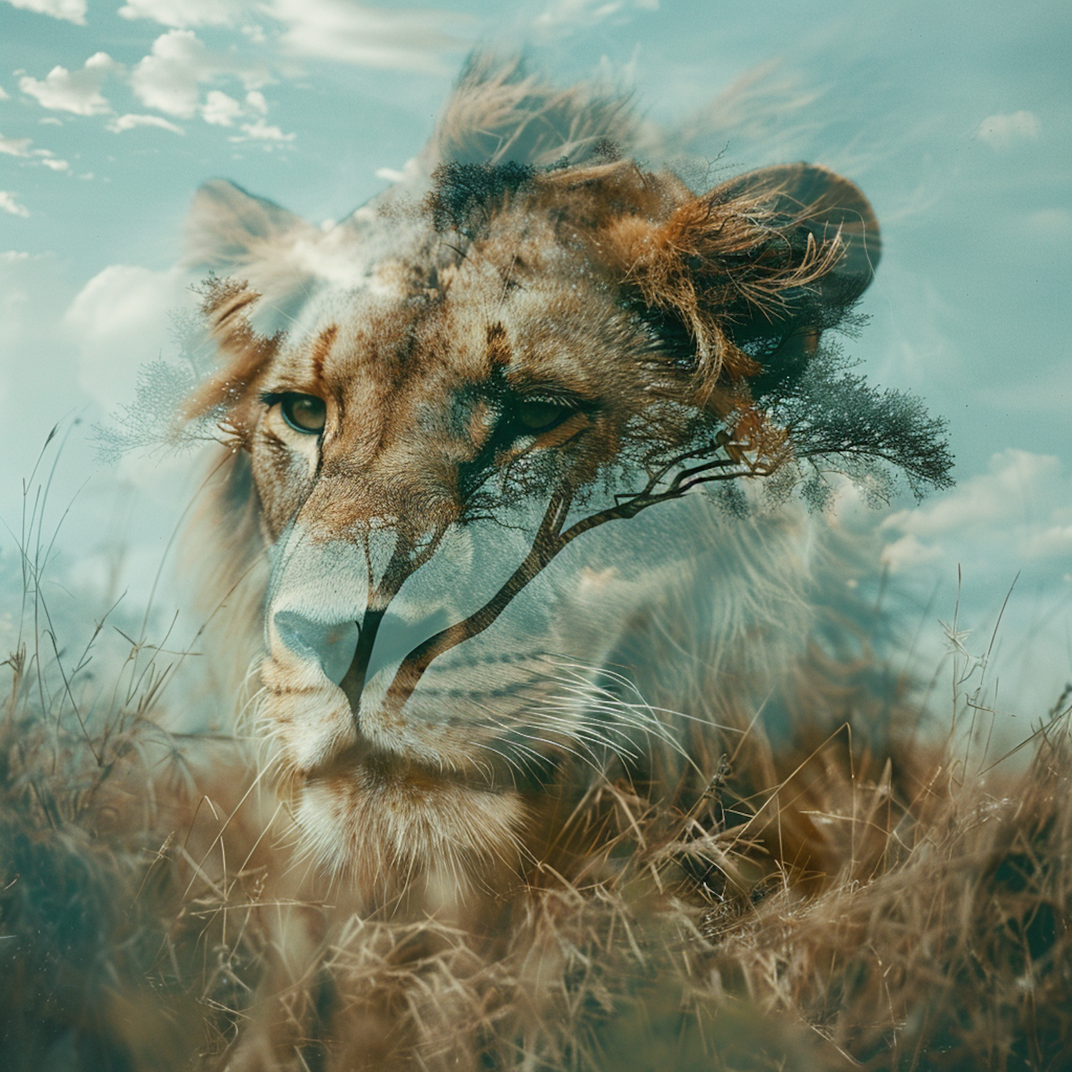 Double exposure of a lion's face merged with a savanna landscape, featuring an acacia tree and a serene blue sky with scattered clouds.