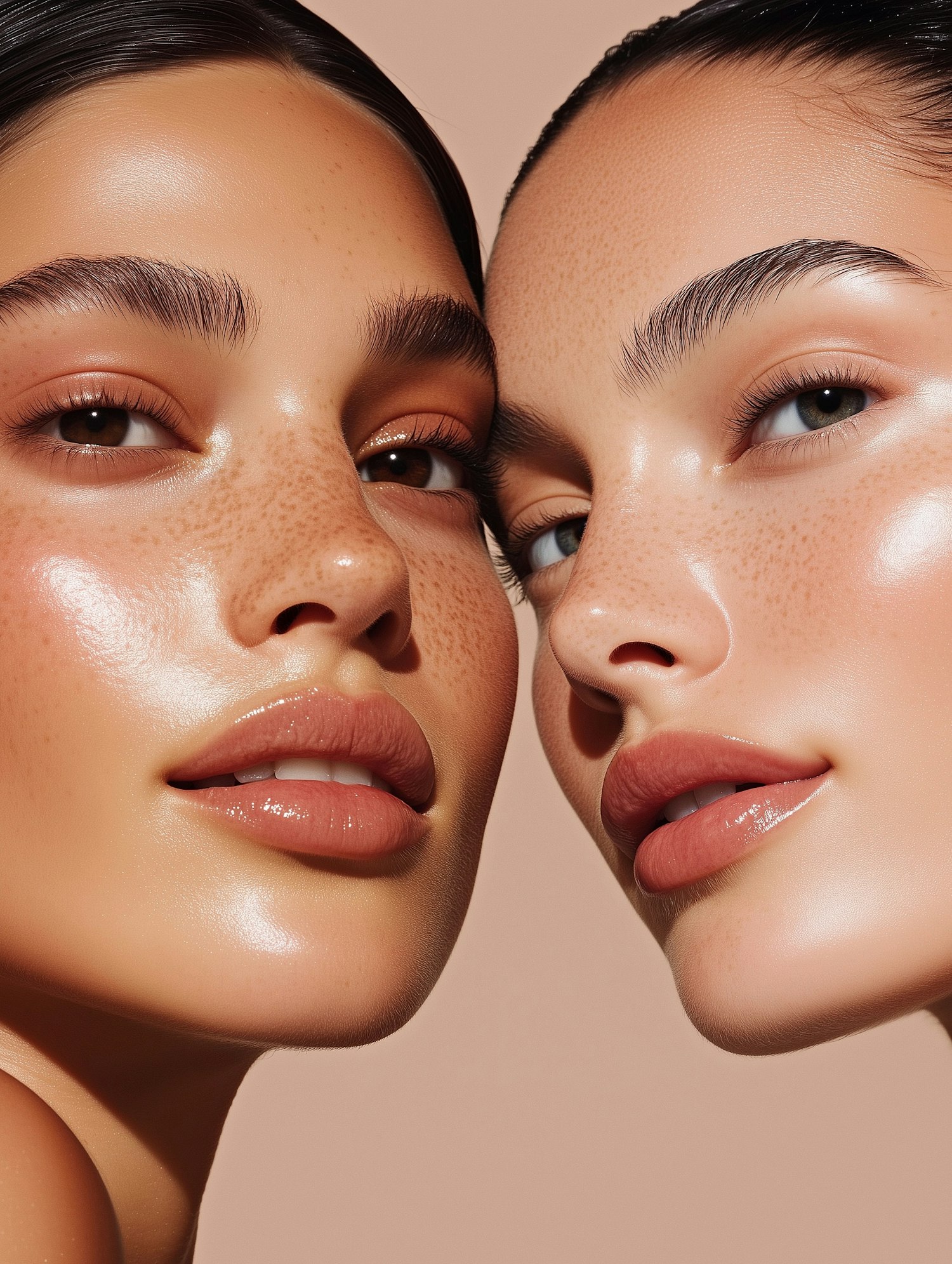 Two women with glowing skin and freckles, showcasing natural beauty with glossy lips and sleek hair against a beige background.