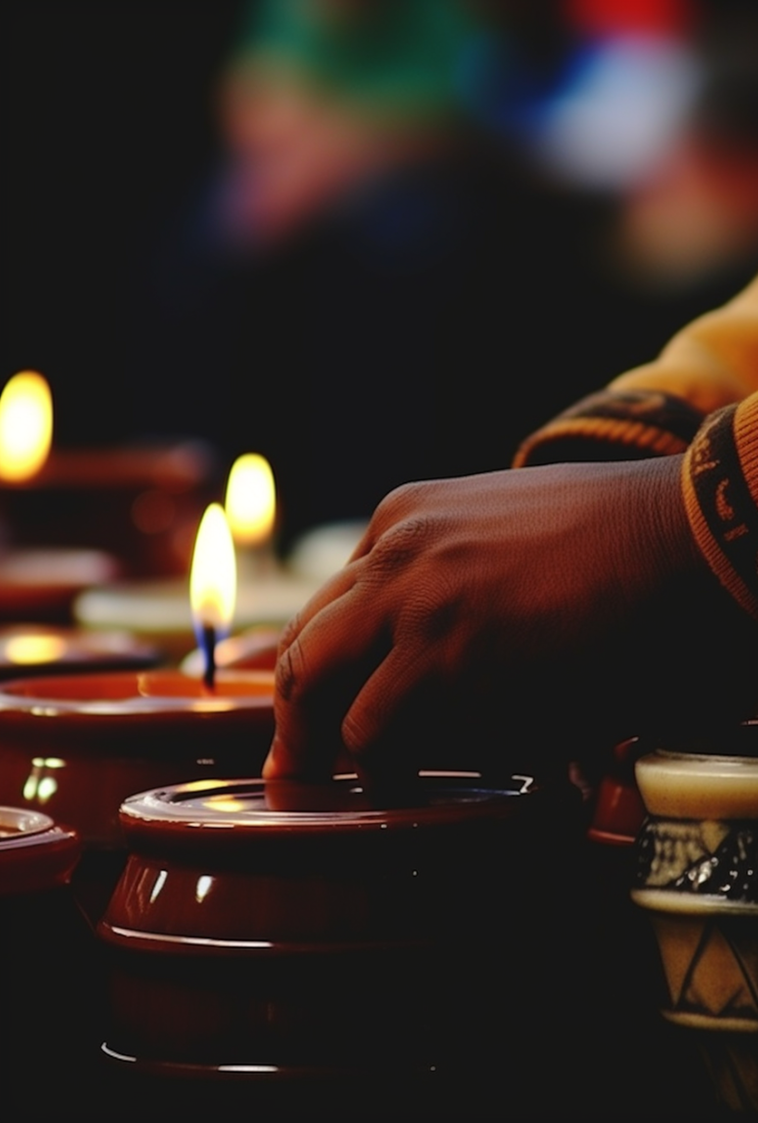 Close-up of a hand in traditional attire interacting with red ceramic containers, surrounded by lit candles in a serene ambiance.