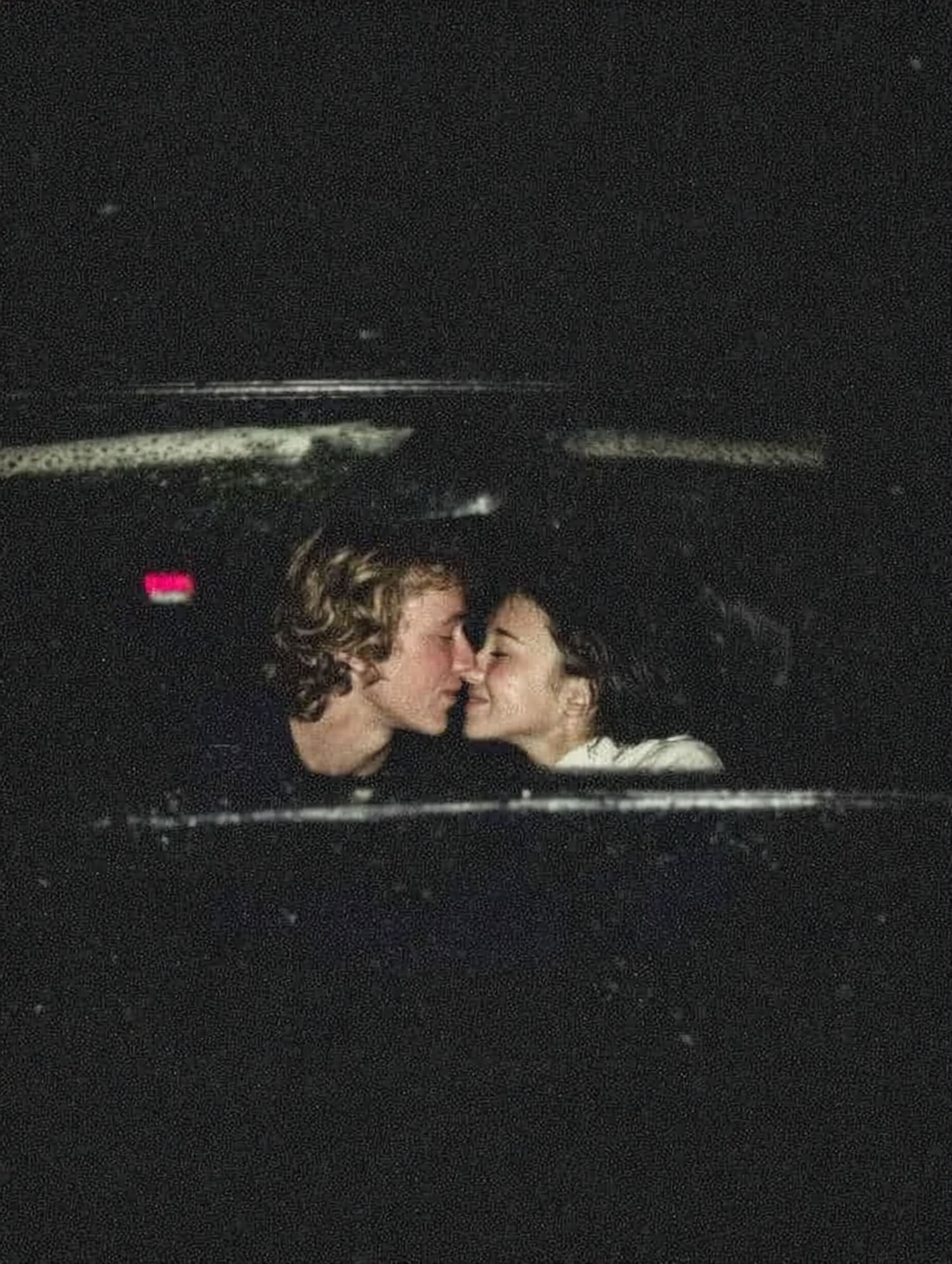 A candid moment of two people sharing a close connection in a car at night, with a cozy and nostalgic atmosphere.