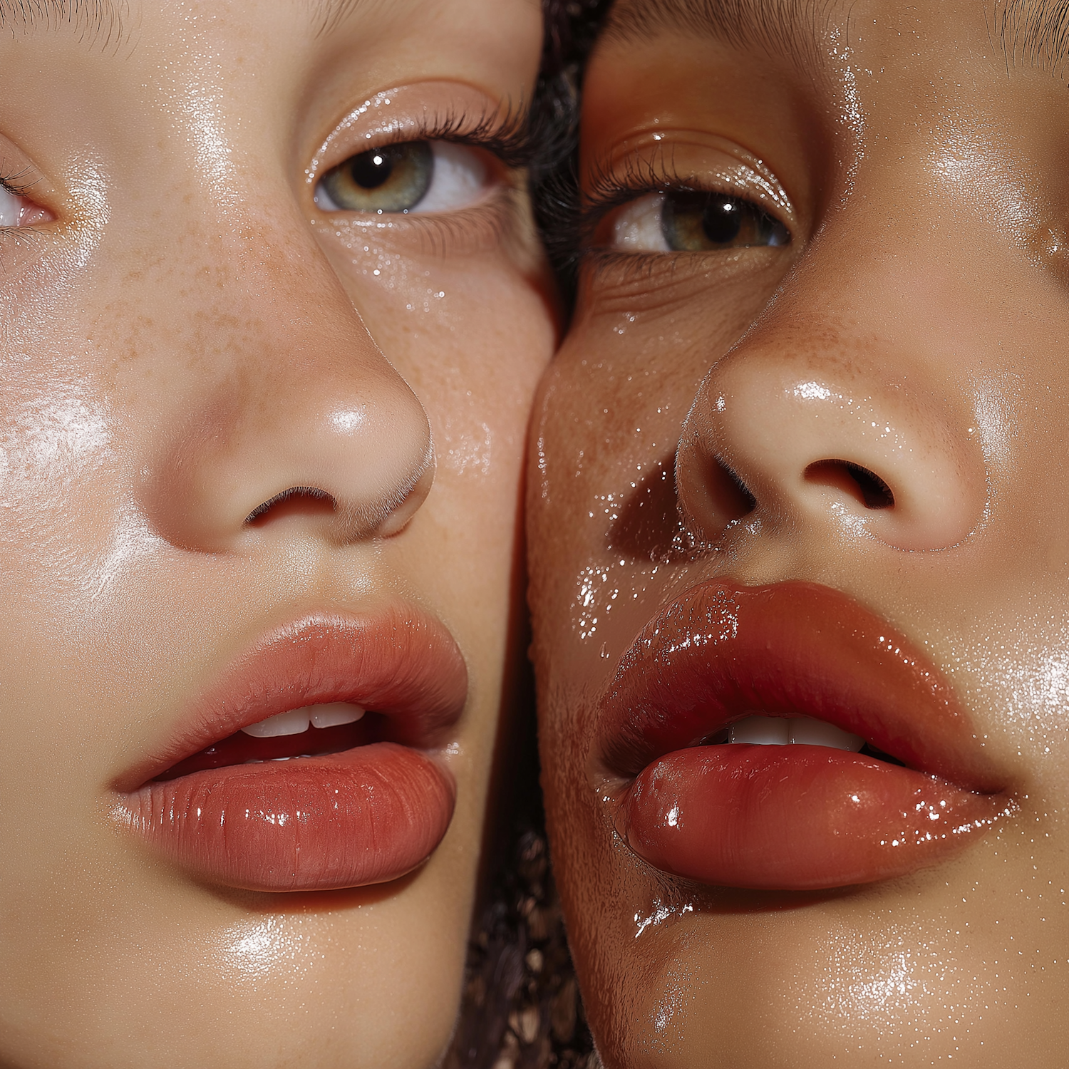 Close-up of two women with dewy skin and natural makeup, highlighting their contrasting skin tones and features.