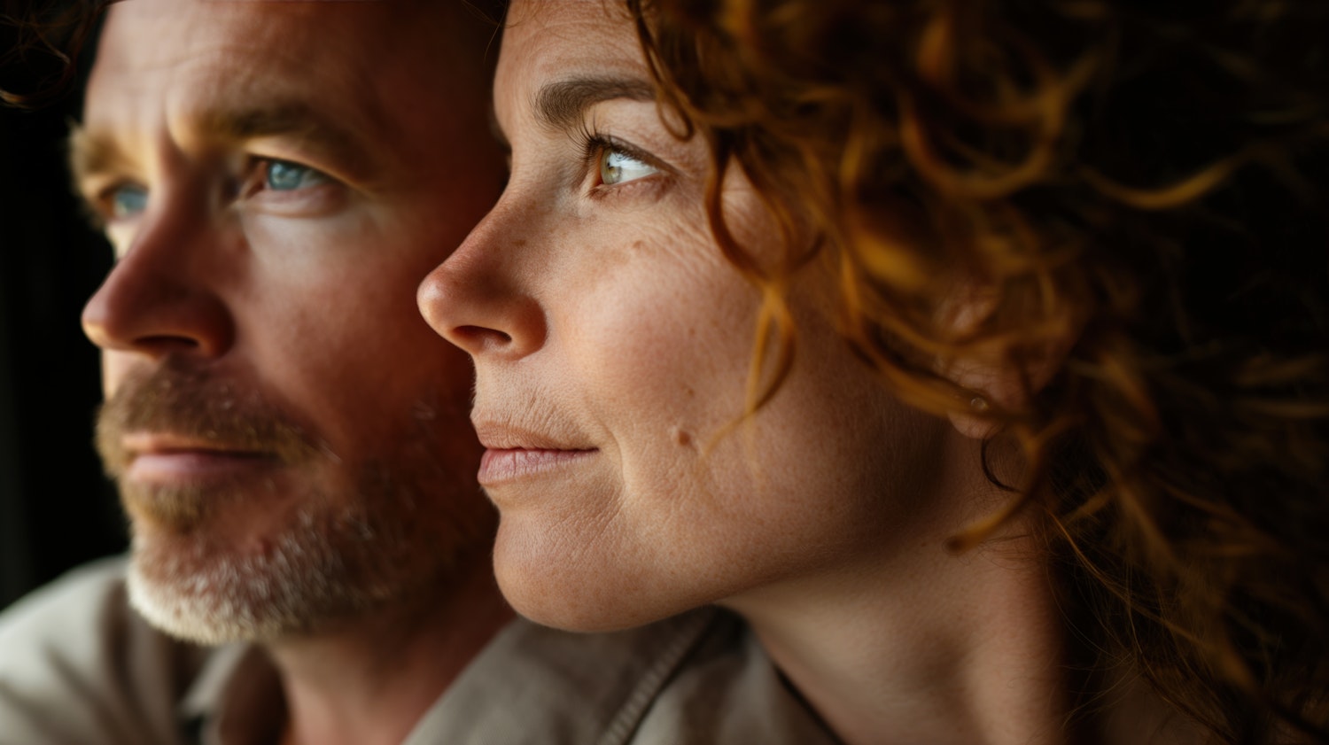Close-up of a thoughtful couple with red and gray hair, gazing into the distance with serene expressions.