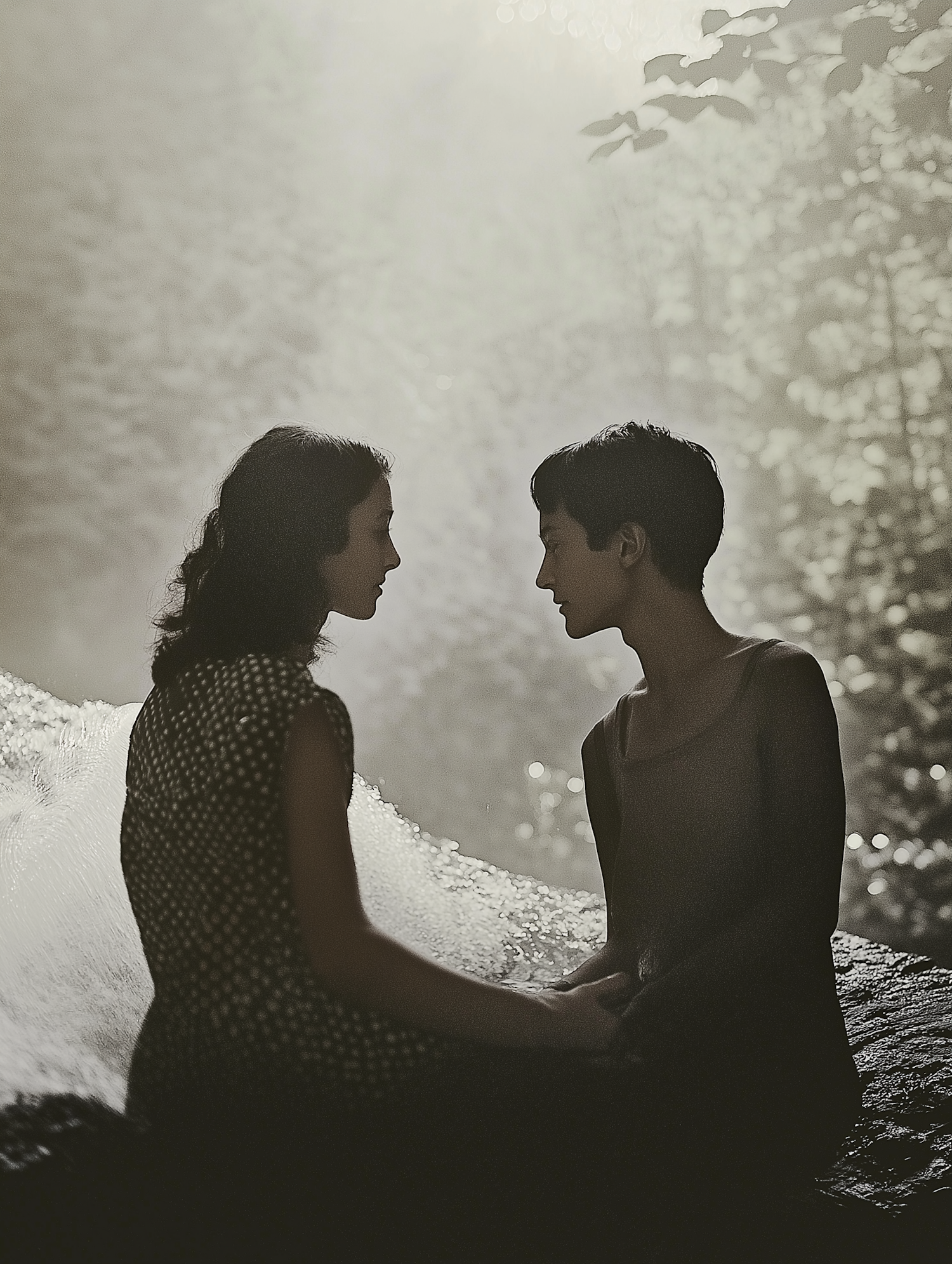 Two women sit closely, holding hands in a serene, softly lit outdoor setting, creating an intimate and peaceful atmosphere.