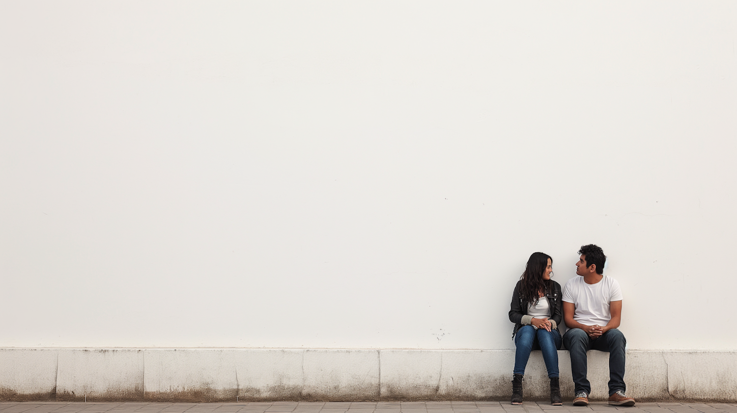 A young couple sits against a vast white wall, sharing a moment of connection. Minimalist and serene, with a focus on their interaction.