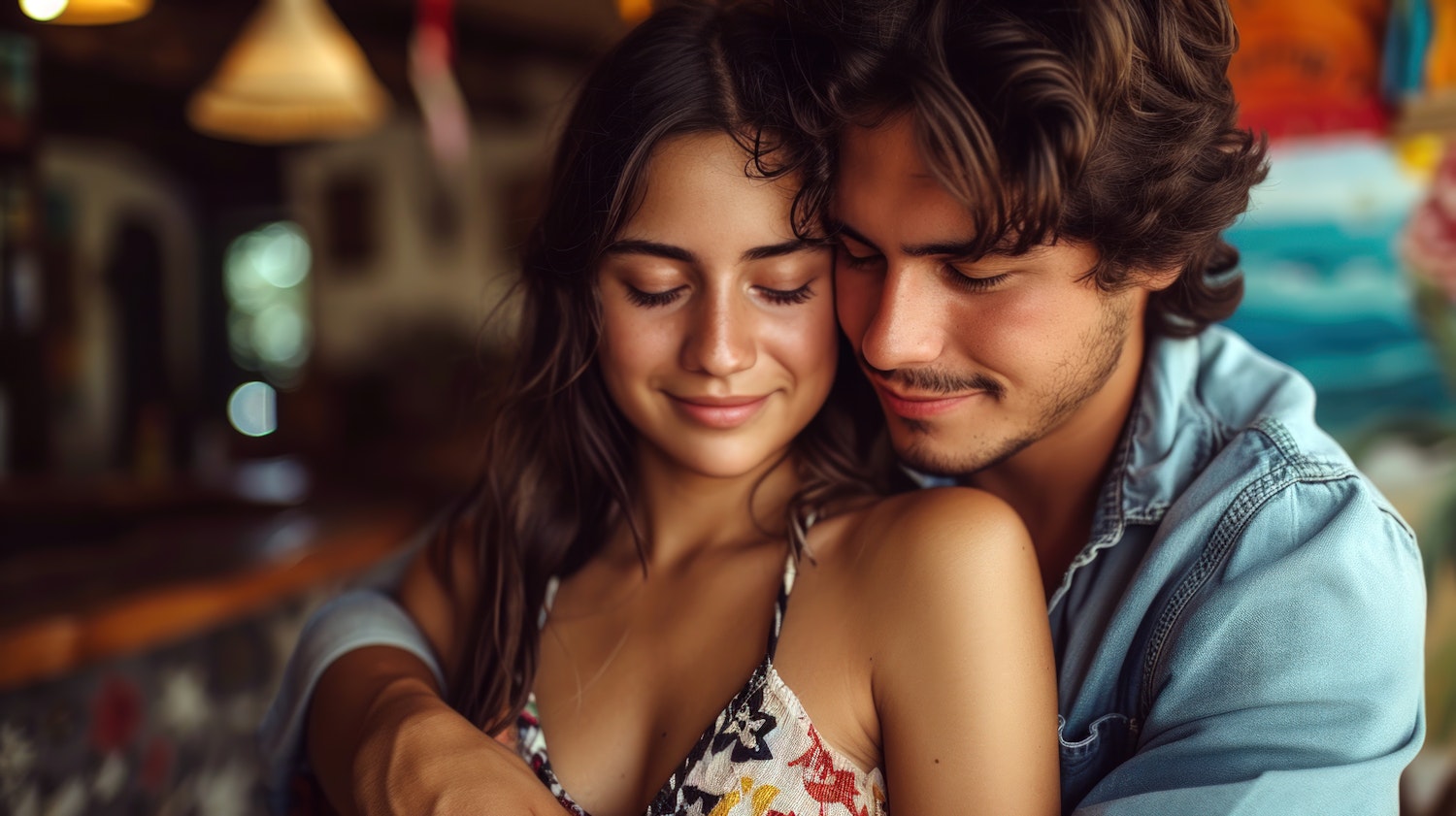 A young couple embraces warmly, with serene expressions and soft lighting, creating a cozy and intimate atmosphere.