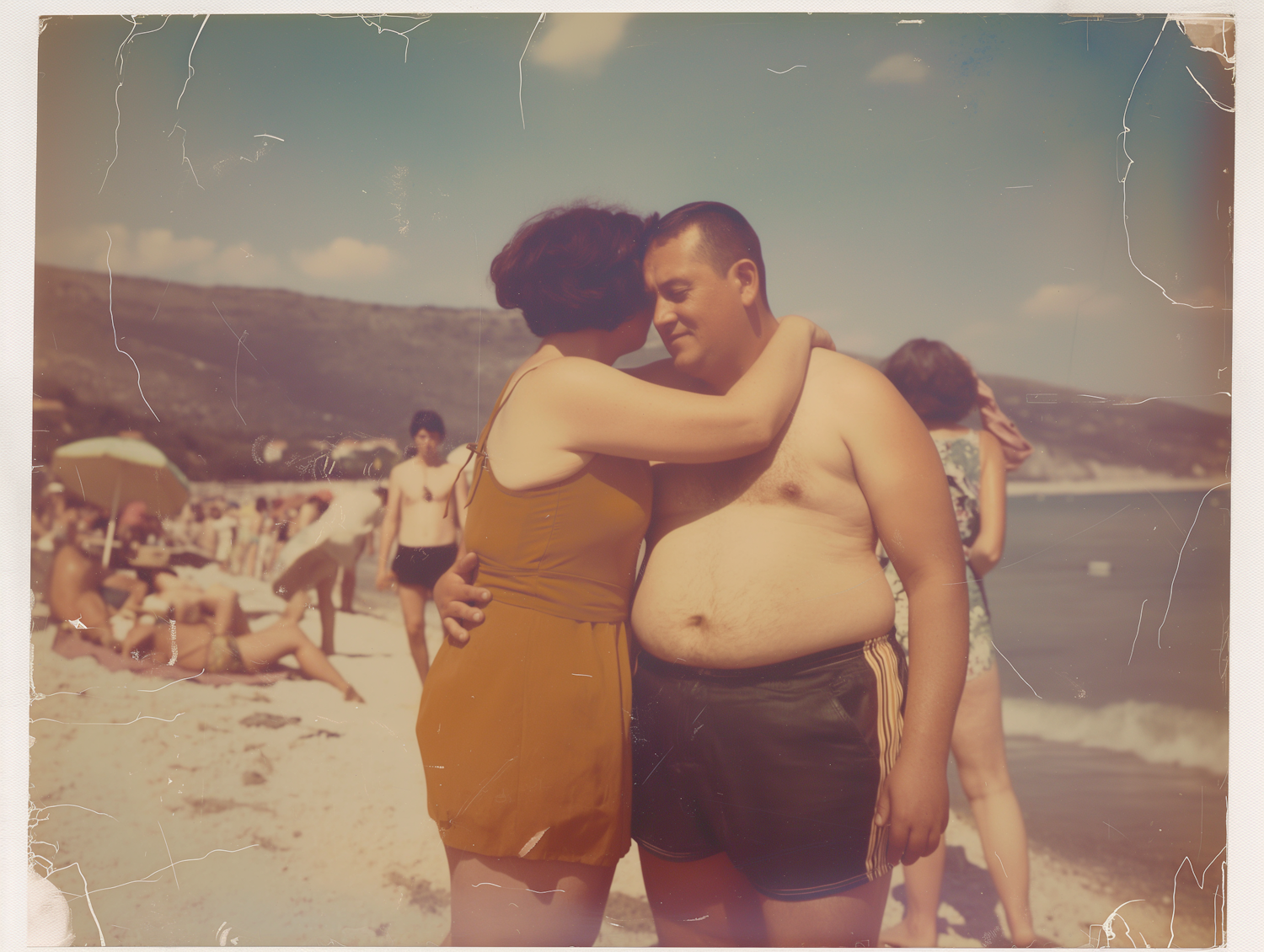 Vintage beach scene with a couple embracing, surrounded by beachgoers and a scenic backdrop. Nostalgic and serene atmosphere.