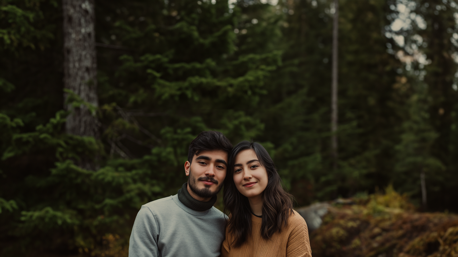 A young couple poses affectionately in a lush forest, wearing cozy sweaters and surrounded by serene greenery.