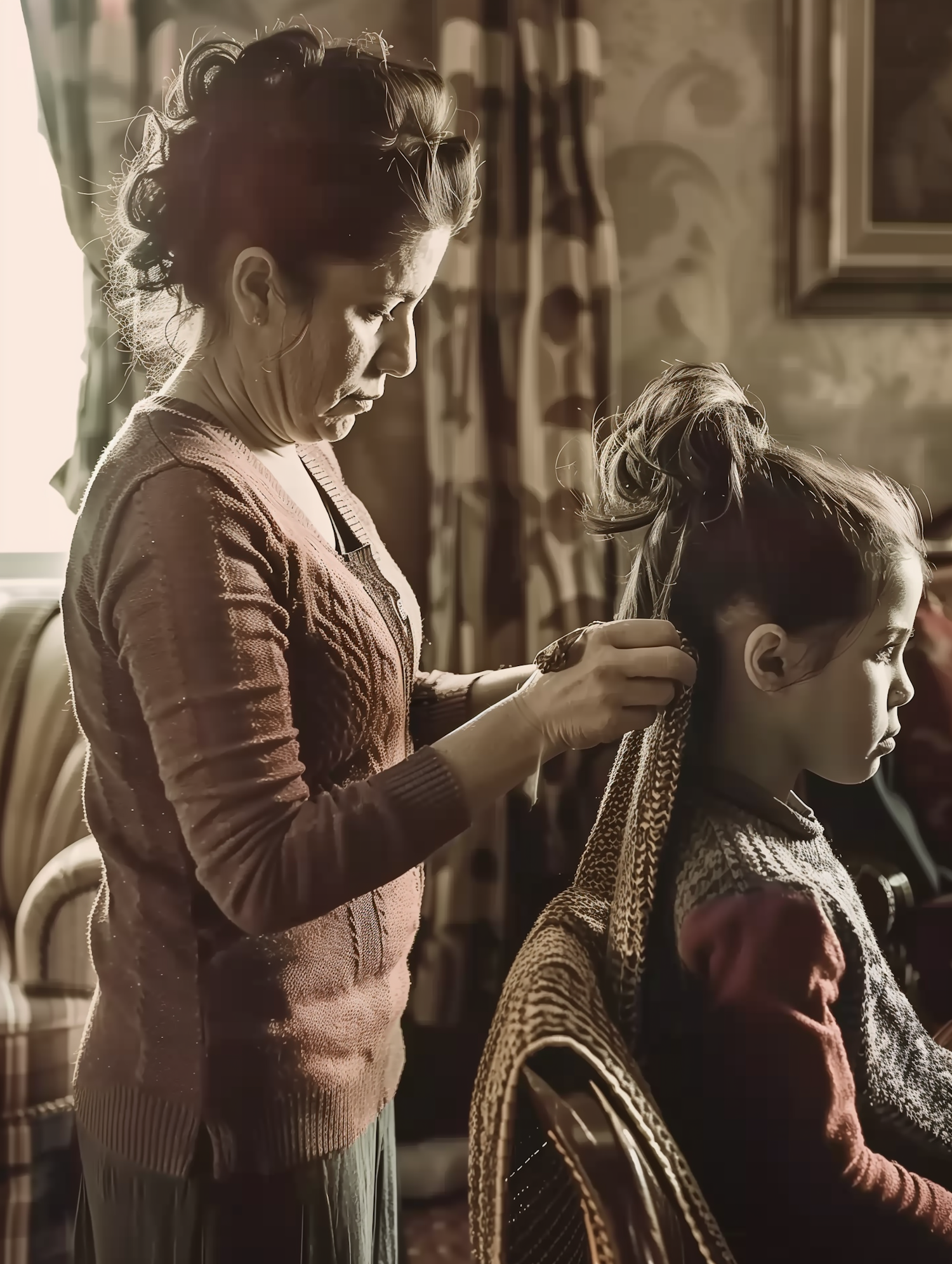 A woman ties a young girl's hair in a cozy, vintage-style room with warm lighting and patterned curtains.