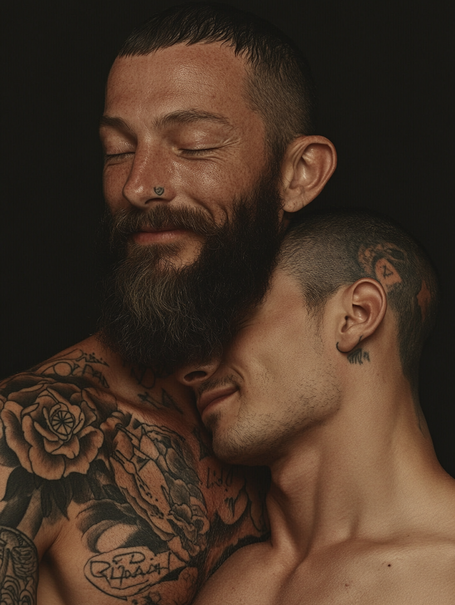 Two tattooed men share a tender embrace, exuding warmth and connection. One has a beard and nose ring, the other a shaved head.