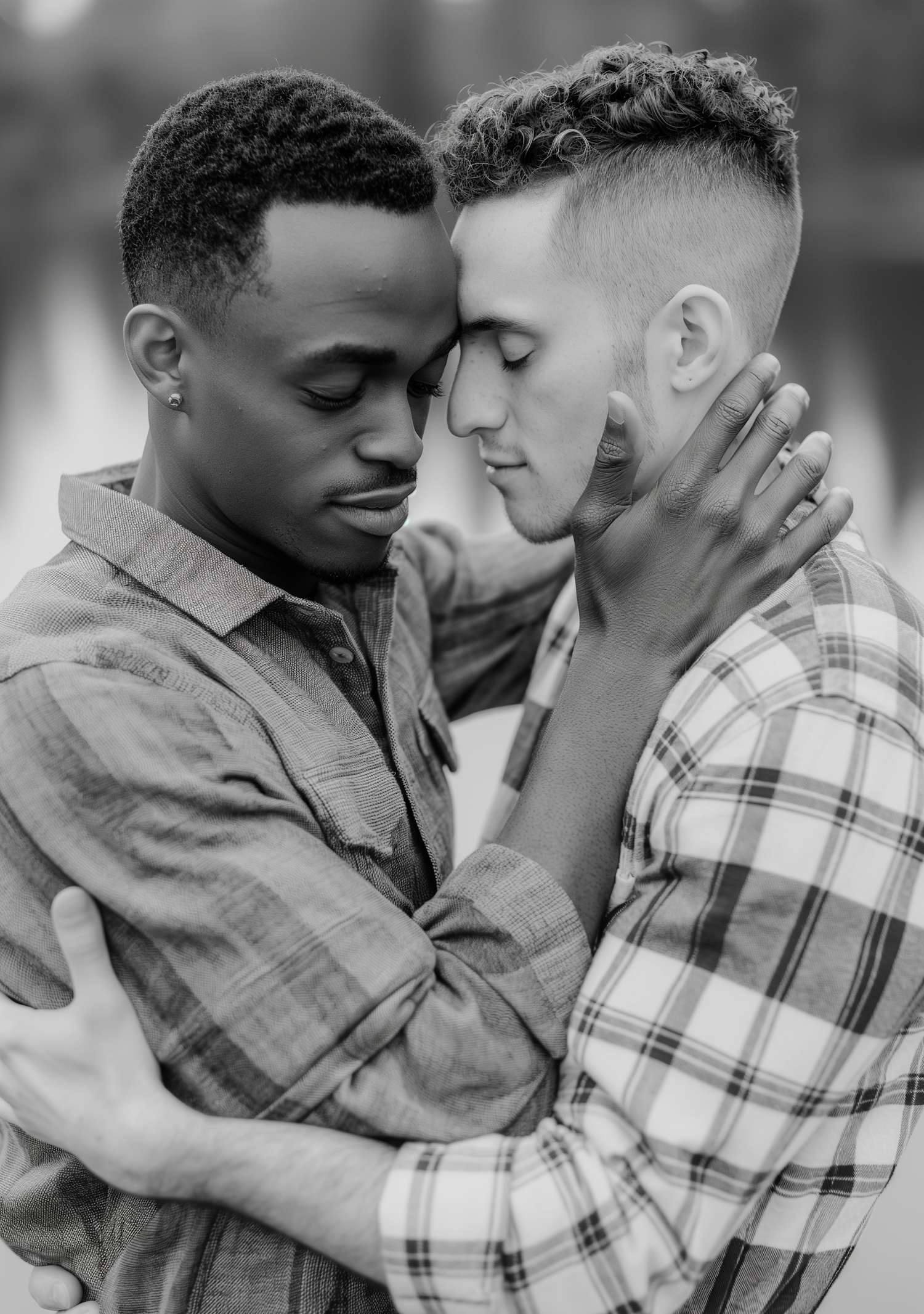 Black and white photo of two men embracing tenderly, eyes closed, expressing deep connection and intimacy.