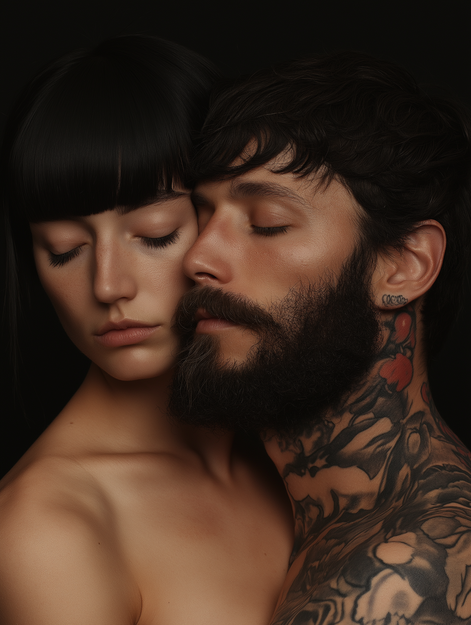 Intimate close-up of a tattooed man and a woman with bangs, both with eyes closed, against a dark background.