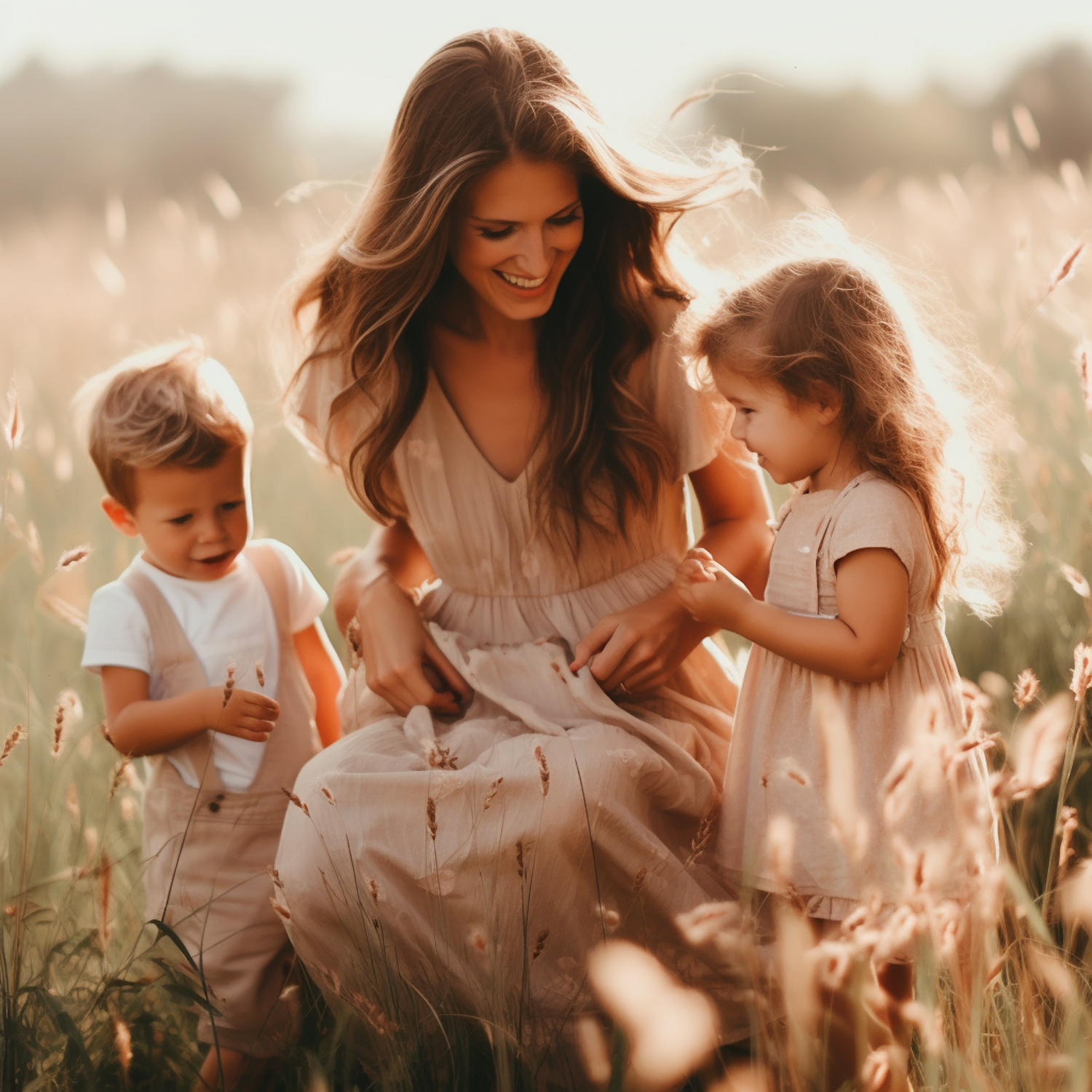 A mother and her two children enjoy a sunny day in a meadow, surrounded by tall grasses and warm sunlight.
