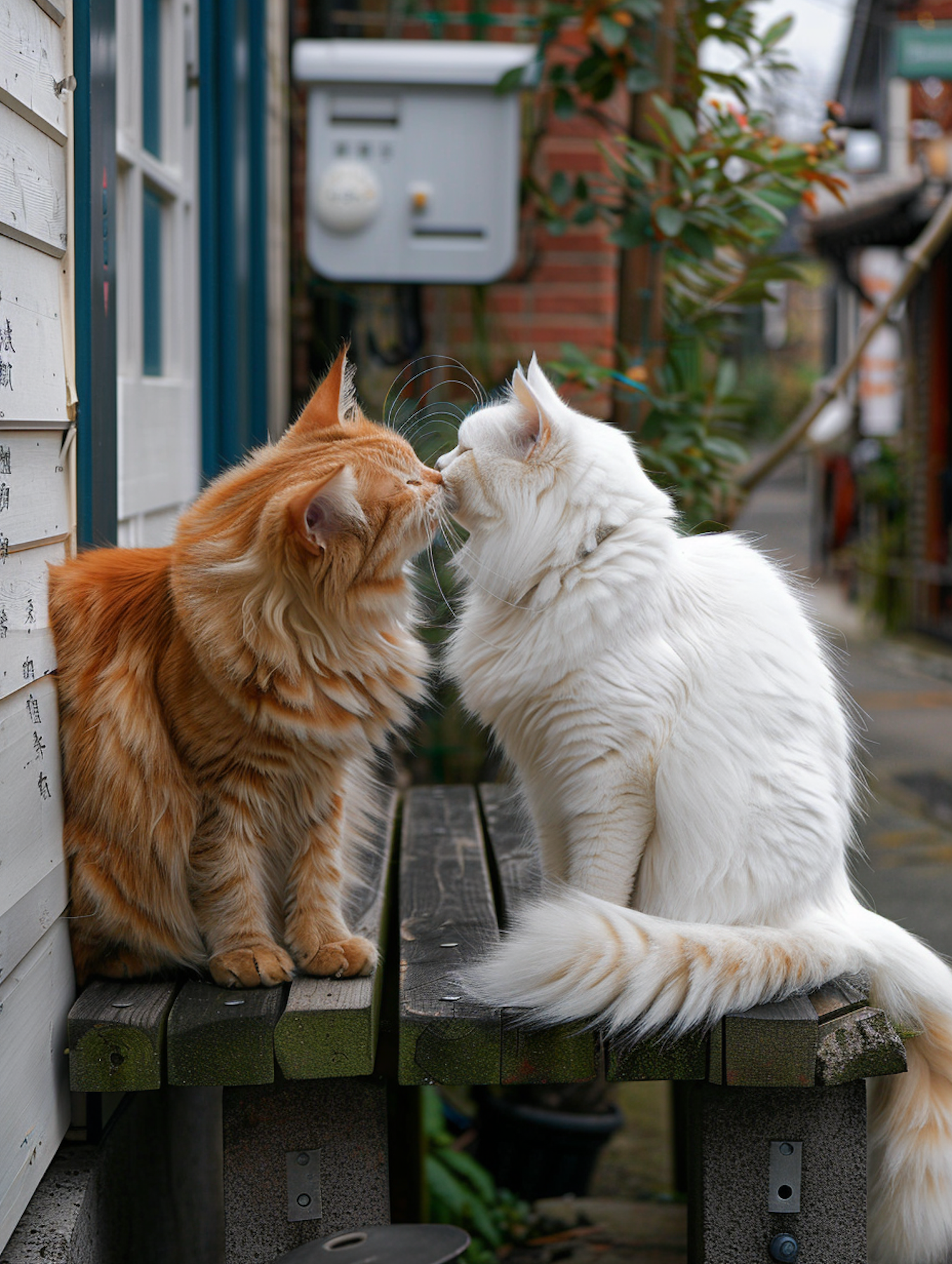 Two fluffy cats, one orange tabby and one white, share a tender moment on a wooden bench in a rustic outdoor setting.