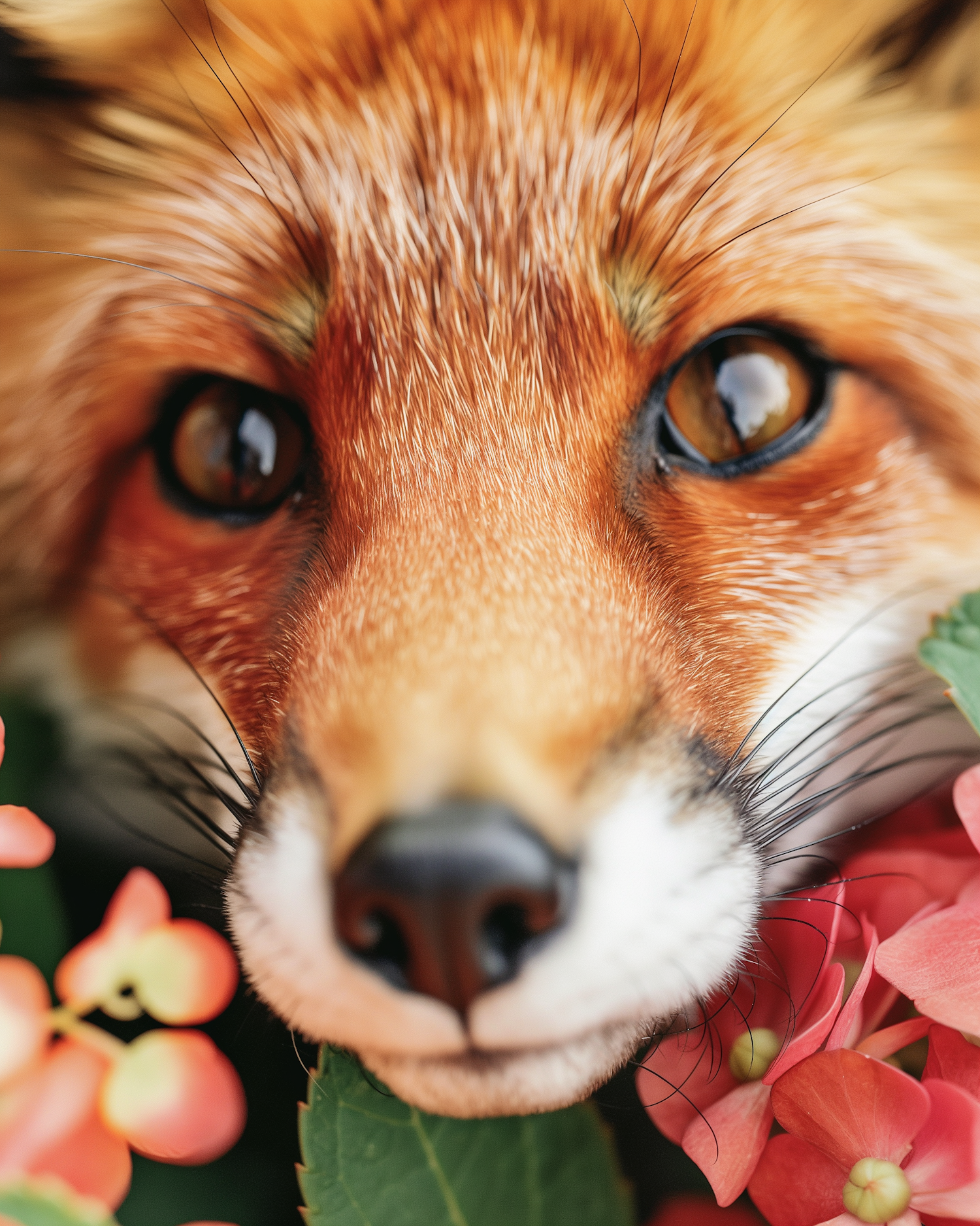 Close-up of a red fox's face with expressive eyes, surrounded by vibrant pink flowers, highlighting its striking orange fur.