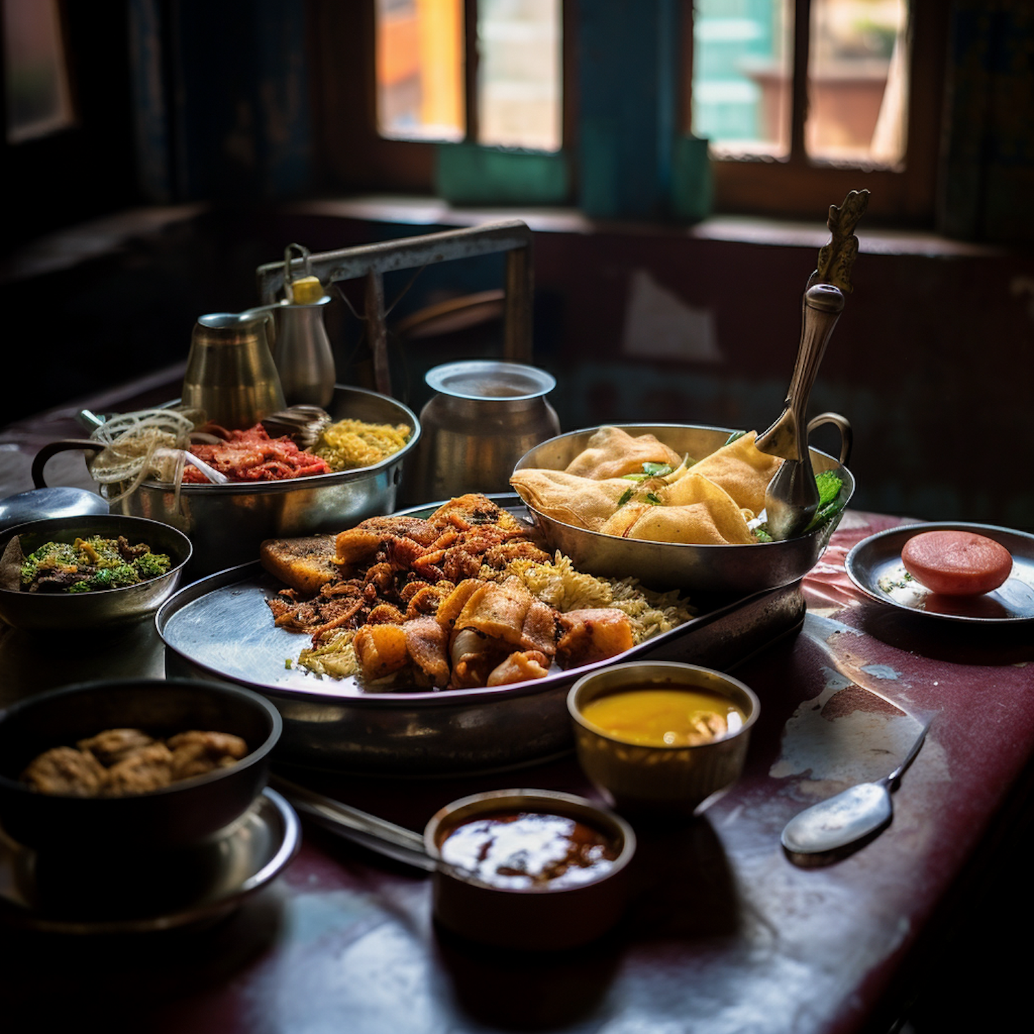 A traditional Indian meal with fried snacks, curries, and papadums on a rustic table, creating a warm and inviting dining scene.