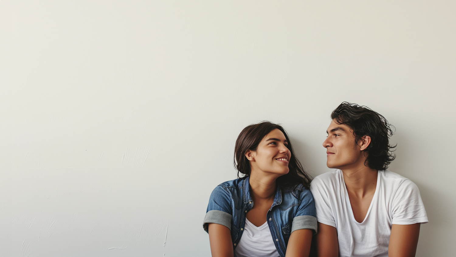 A young couple sharing a tender moment, sitting against a white background, smiling at each other with affection.