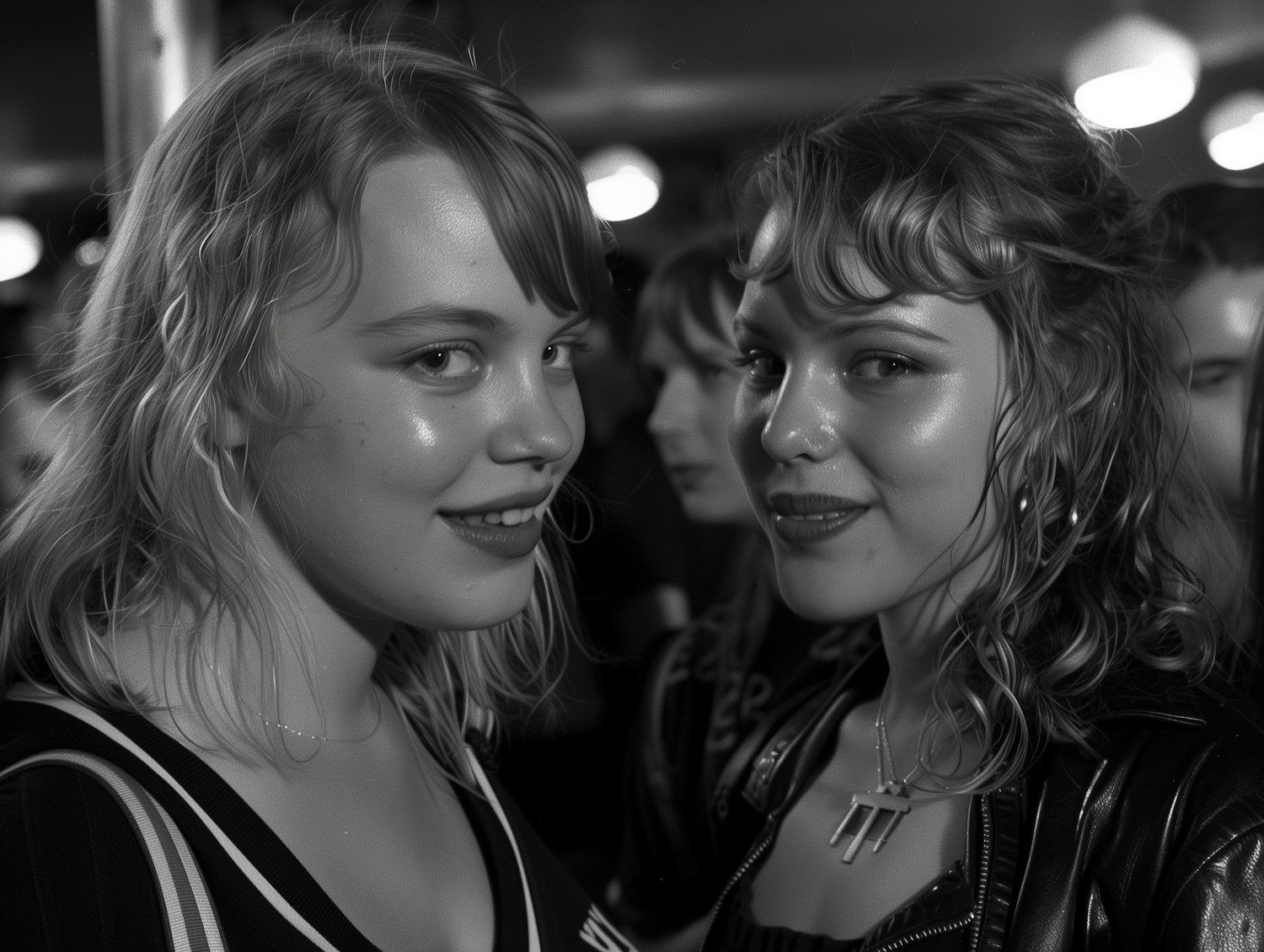 Two young women with blonde hair and light skin smile at the camera in a lively indoor setting, wearing casual outfits and accessories.