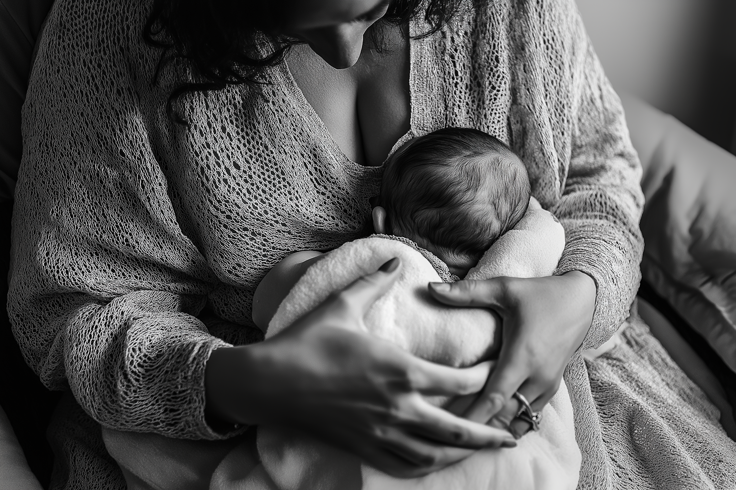 Black and white photo of a mother cradling her newborn, wrapped in a blanket, showcasing a tender and intimate moment.