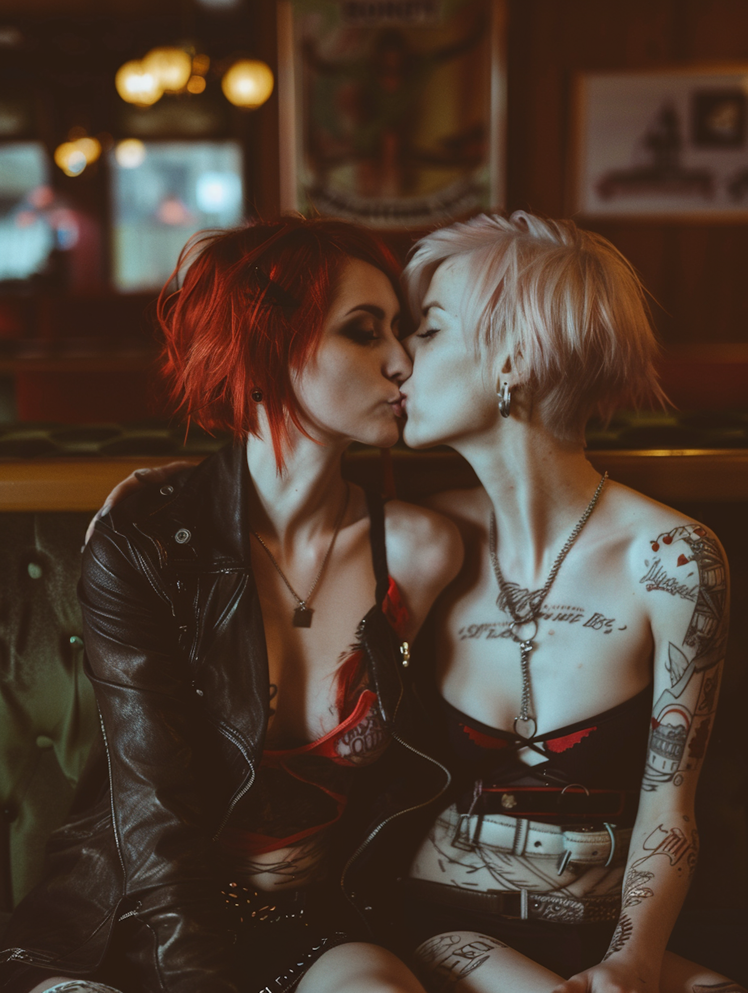 Two tattooed women with punk style share a kiss in a dimly lit, cozy setting, showcasing their unique fashion and bold hairstyles.