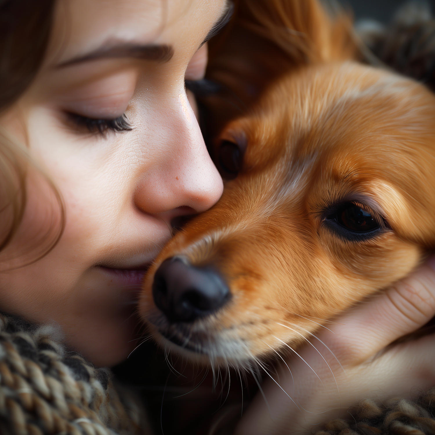 A tender moment between a young woman and her golden-furred dog, capturing a serene and affectionate embrace.