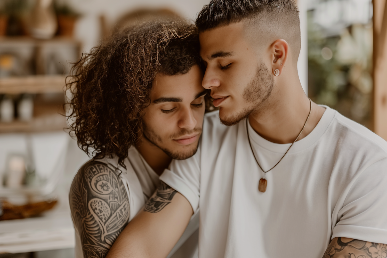 Two young men share a tender embrace, eyes closed, in a cozy setting. Both wear white t-shirts, one with tattoos, the other with a necklace.