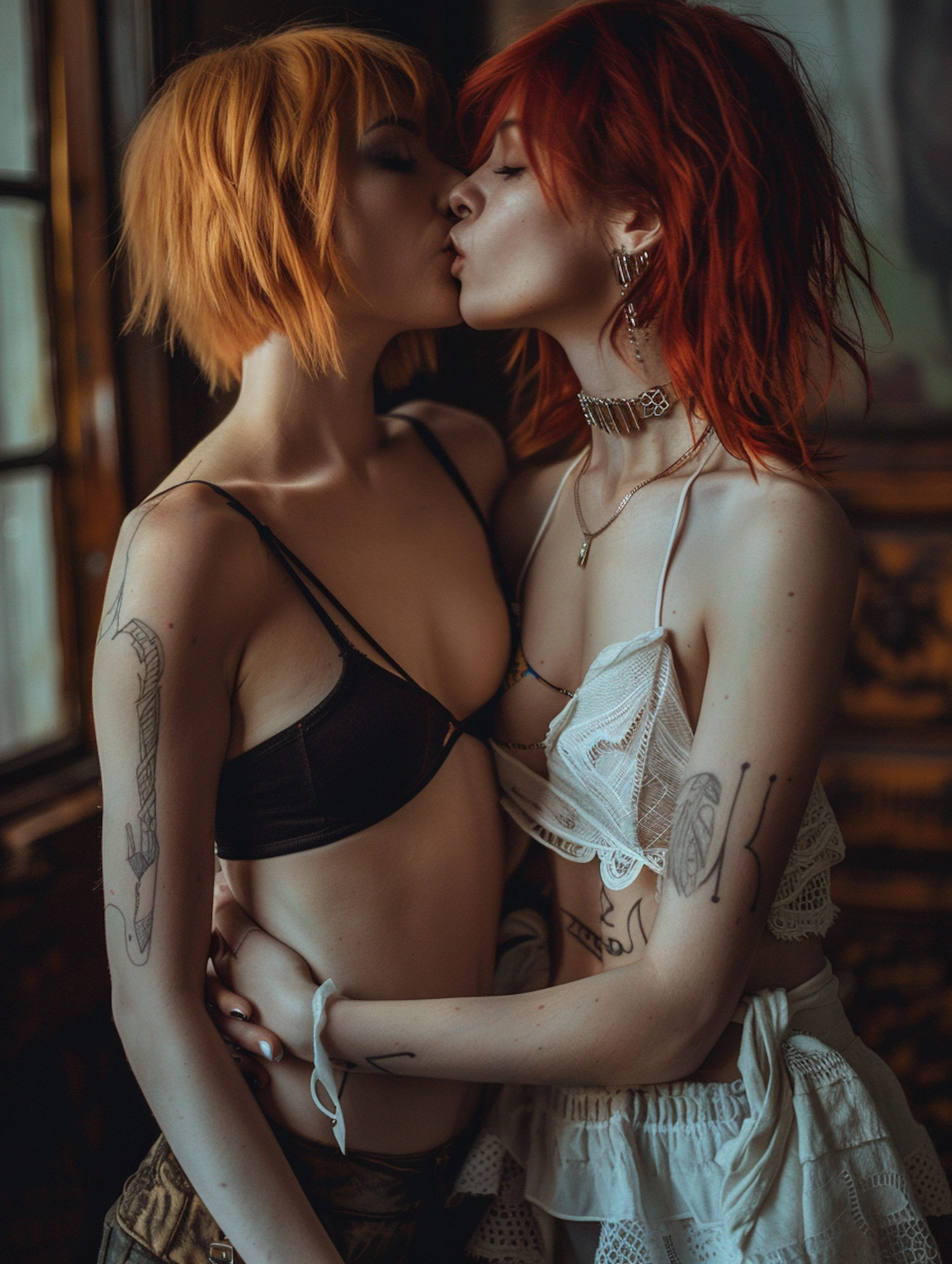 Two women with vibrant hair colors share an intimate kiss, showcasing tattoos and a close embrace in a warmly lit setting.