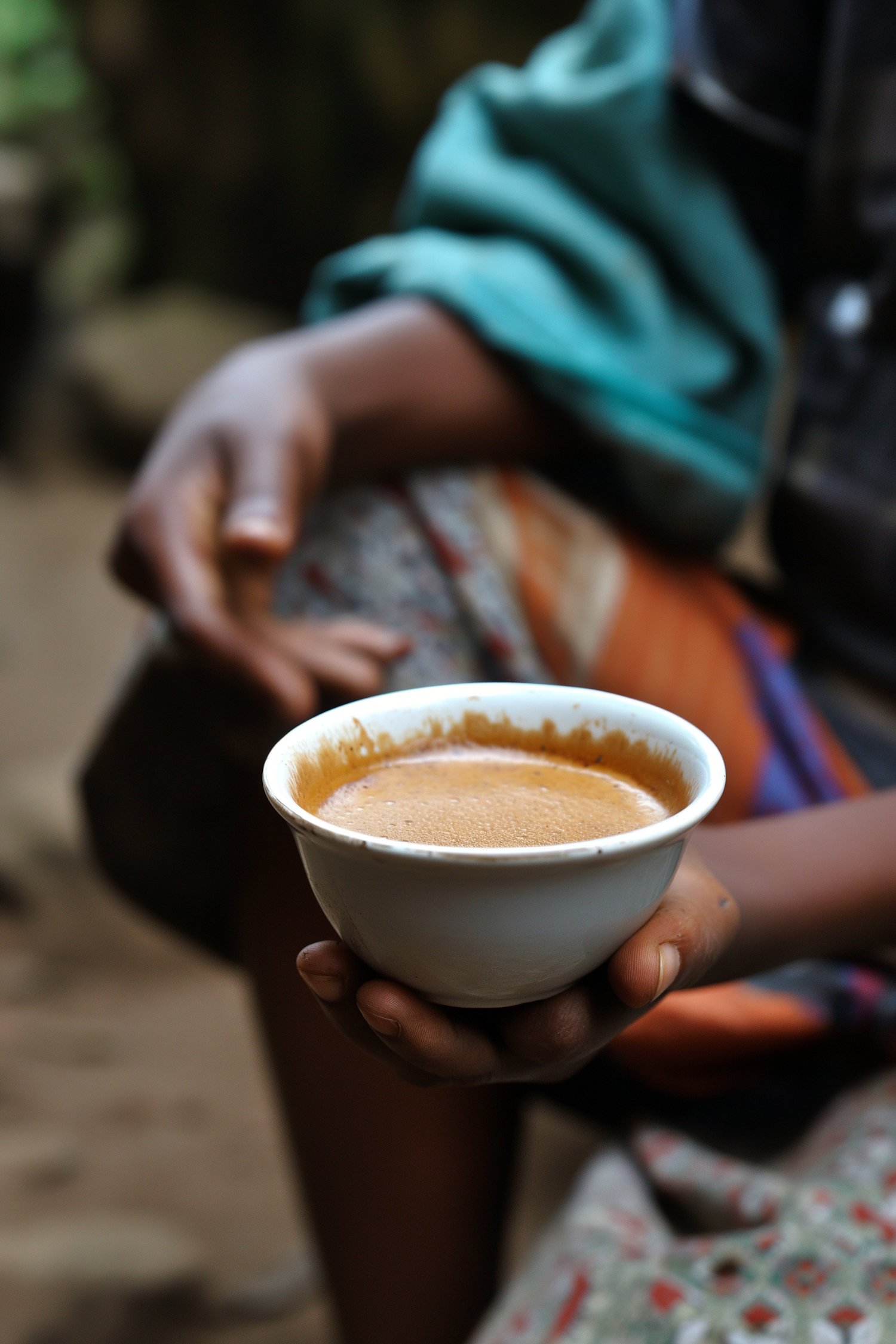 Close-up of a hand holding a bowl of frothy coffee or tea, with colorful clothing in the background.
