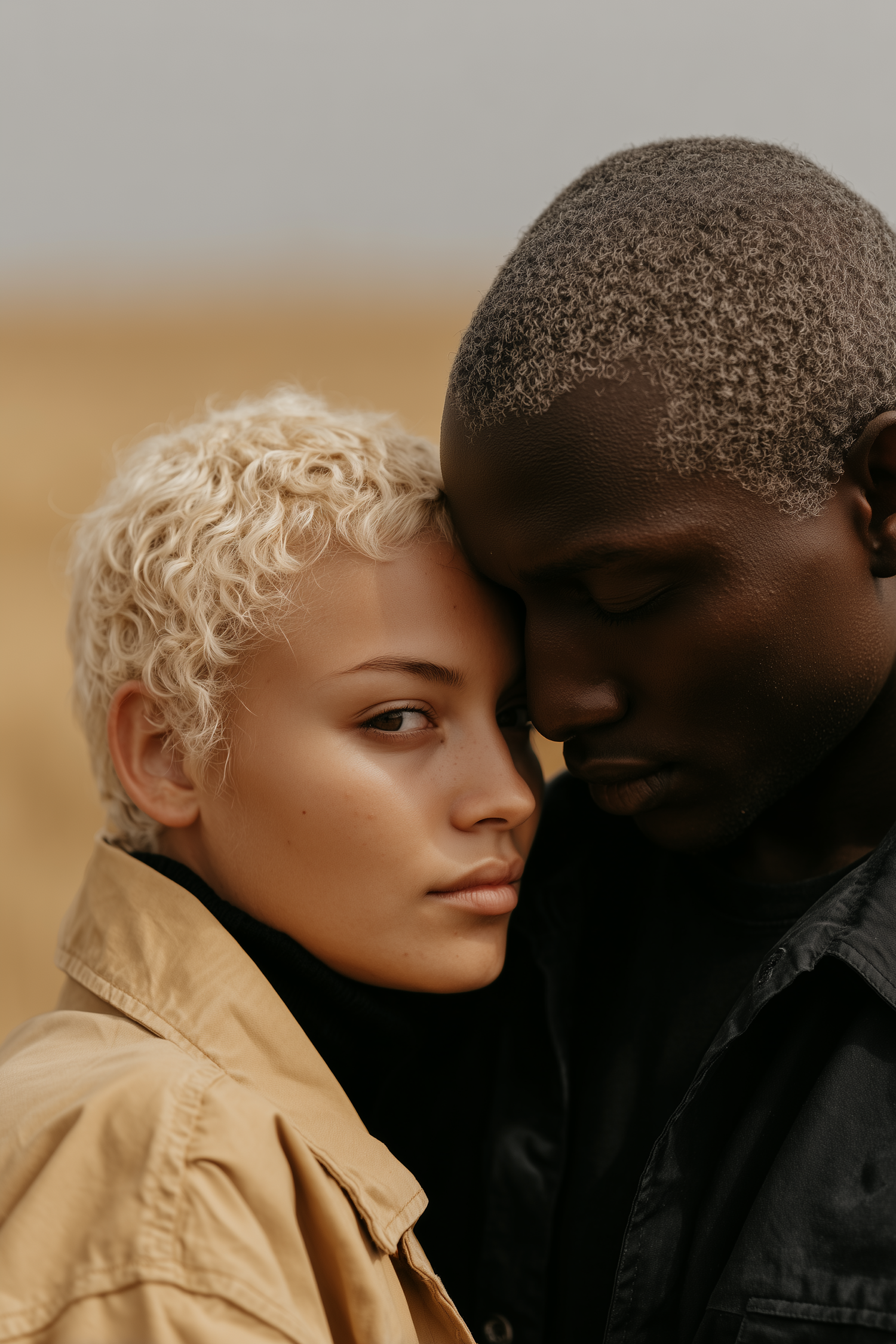 A close-up of two individuals in an intimate pose, one with blonde curls and the other with textured hair, against a softly blurred background.
